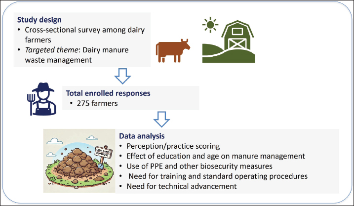 AbstractBackground: Manure waste disposal is an essential aspect of dairy farm biosecurity and significantly impacts farm productivity, animal health, public health, and environmental sustainability. Improper manure management can contribute to pathogen spread, groundwater contamination, and environmental pollution, necessitating targeted interventions. Aim: This study aimed to explore the perceptions, practices, needs, and challenges faced by dairy farmers in Punjab in relation to manure management and its broader implications. Methods: A cross-sectional survey was conducted among 275 dairy farmers in Punjab using a structured questionnaire. The questionnaire included closed-ended, Likert scale-based, and open-ended questions addressing key aspects of manure management. Data were analyzed to explore associations between demographic factors (gender, age, education, herd size) and manure management practices. Results: The analysis revealed that most respondents (66.9% strongly agreed, 33.1% agreed) recognized manure as an effective fertilizer. However, 43.6% strongly disagreed that dung odor should be considered a source of environmental contamination or health concern, and only 47.3% linked manure to pathogen spread. The opinions on groundwater contamination were divided, with 41.1% agreeing and 43.6% strongly disagreeing. Risk practices identified included 92% of farmers storing dung within residential areas and 50.9% handling dung barehanded. Significant associations were observed between demographics and perceptions/practices, with higher education and larger herd sizes positively influencing adherence to proper manure management practices. The farmers emphasized the need for subsidies and training to improve their manure management practices. Conclusion: The study highlights gaps in manure management practices among dairy farmers and underscores the need for targeted interventions, policy support, and awareness campaigns. Strengthening sustainable manure management through collaboration with farmers, extension agencies, researchers, and policymakers, along with innovative approaches, is essential for enhancing farm biosecurity, safeguarding animal, and public health, and ensuring agricultural sustainability. Keywords: Biogas, Cattle, Dairy, Farm biosecurity, Manure, Pathogens. IntroductionThe dairy industry is fundamental to India’s agricultural sector, and it contributes significantly to rural livelihoods and the national economy. With a milk production of 14 million tons in 2023–2024, Punjab accounts for approximately 5.9% of India’s total milk output (BAHS, 2024). Modern dairy farming is primarily operated under intensive confinement systems where cows are milked one to three times daily. To maintain hygiene standards and minimize the risk of udder infections, routine cleaning of dairy sheds is typically performed at least twice daily, commonly after each milking session. This regular cleaning schedule is essential to ensure a clean environment between milking sessions and to support optimal udder health and milk quality. However, improper or unregulated waste disposal from these operations poses serious threats to animal and public health and the environment (Gržinić et al., 2023). The indiscriminate discharge of dung and wastewater can contaminate the farm environment, clog drainage systems, and pollute nearby rivers and water bodies. Further, the stagnant water created by blocked drains fosters mosquito breeding, elevating the risk of vector-borne diseases and releasing unpleasant odors into the community. Additionally, the decomposition of dung produces gases such as carbon dioxide, ammonia, hydrogen sulfide, and methane, which contribute to air pollution, odor issues, and greenhouse gas emissions, thereby exacerbating climate-related concerns (Ministry of Environment, Forest and Climate Change, 2020). Addressing these challenges necessitates the development and implementation of comprehensive farm waste management systems that integrate multiple strategies, including composting manure solids, employing anaerobic digestion to produce biogas, adopting precision nutrient management, and implementing effective wastewater treatment, to minimize environmental impacts and enhance resource efficiency (Bai et al., 2017; Gyadi et al., 2024). Utilizing livestock manure as a fertilizer is a well-documented practice, valued for its high nutrient and moisture content (Ayamba et al., 2021). This approach can reduce the dependency on chemical fertilizers and decrease the need for irrigation for crop production (Khan et al., 2022). However, when not properly managed, manure can lead to significant environmental degradation, affecting soil, water, and air quality (Erisman et al., 2008). Pathogens in livestock manure, such as Salmonella spp., Campylobacter spp., Listeria monocytogenes, Yersinia enterocolitica, Escherichia coli, Cryptosporidium parvum, and Giardia lamblia, pose animal and public health risks (Pachepsky et al., 2006). The microorganisms are often shed asymptomatically in the manure of infected animals and may contaminate the environment if manure is inadequately managed (Doyle and Erickson, 2006). The survival rates of pathogens vary based on environmental conditions, with some pathogens persisting for extended periods (Wang et al., 2004). Strategies for pathogen inactivation include prolonged manure storage, composting, vermicompost, and anaerobic digestion (Dong et al., 2022). Effective manure management techniques such as piling and aeration create conditions that facilitate microbial degradation and pathogen reduction (Erickson et al., 2010; Chen and Jiang, 2014). High nutrient concentrations in the environment are linked to the excessive application of fertilizers and manure, intensive livestock farming, and suboptimal agricultural practices (Herrero and Gil, 2008). Effective manure management requires a holistic approach that incorporates both on-farm and off-farm s