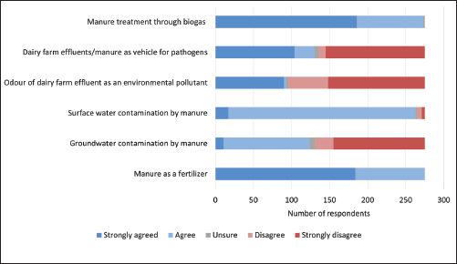 Fig. 2. Stakeholder perceptions of key risks and management aspects of dairy manure handling. Perception about manure managementMost respondents across all regions strongly agreed (n = 184, 66.9%) or agreed (n = 91, 33.1%) that manure is an effective fertilizer. A total of 43.6% (n=120) respondents strongly disagreed that dung odor should be considered a source of environmental or health concern, while 47.3% (n = 130) linked manure to pathogen spread. Interestingly, 41.1% (n = 113) of respondents agree and 43.6% (n = 120) strongly disagree that manure can contaminate groundwater. However, it is widely agreed that dairy farm wastewater might infiltrate surface water sources. The frequency data distribution of the perception-related parameters is presented in Figure 2. The awareness of the potential role of mismanaged dairy farm effluents and manure in pathogen transmission varied significantly across age groups. Among respondents over 50 years of age, only 30.3% (23/76) agreed with related statements, while 69.7% (53/76) disagreed, indicating relatively low awareness in this group. The 41–50 years group was nearly divided, with 48.3% (43/89) agreeing and 51.7% (46/89) disagreeing. In contrast, 74.7% (56/75) of those aged 31–40 years agreed, indicating a higher level of awareness. Notably, the highest awareness was seen among the youngest respondents (<20 and 21–30 years combined), where 85.7% (30/35) agreed and only 14.3% (5/35) disagreed. In addition, education level emerged as a key factor influencing awareness of the public health risks associated with mismanaged dairy effluents and manure. Among respondents without formal schooling, only 3.4% (3/87) recognized the risks, highlighting a significant gap in basic awareness. Awareness gradually improved with increasing education levels. Among those educated up to 5th standard, 33.3% (1/3) agreed with the health risk statements. A more substantial 69.3% (52/75) of individuals with education from 6th to 10th standard demonstrated awareness, increasing further to 90.5% (57/63) among those with 11th to 12th standard education. Among graduates, 95.7% (45/47) agreed, clearly reflecting a positive correlation between higher education and awareness of pathogen transmission risks from dairy farm waste. Practices in dairy waste and manure managementThe analysis of practice-related parameters is presented in Table 2. Only 8% of respondents stored manure at a separate designated location away from residential/ farm areas. A total of 76.7% of respondents used bedding material. A total of 35.6% of respondents changed bedding material at weekly intervals, while 26.2% changed their bedding material at monthly intervals. The majority (40.4%) of respondents used straw as their common bedding material and replaced it weekly. A total of 35.3% of respondents used rubber mats, whereas only 0.7% of respondents used manure as bedding material. About 50.9% of respondents reported handling dung with their bare hands, increasing the risk of exposure to zoonotic pathogens (e.g., E. coli and Salmonella spp.) and other harmful microbes that can lead to infections and disease transmission. Further discussions revealed that many of these farmers were unaware of these potential hazards, highlighting the urgent need to promote safe handling practices and the use of personal protective equipment. All respondents followed cleaning udders before milking, but only 32.4% practiced hindquarter cleaning. Additionally, all respondents who utilized manure as fertilizer on their fields reported having their own transportation arrangements for manure application. Around 82.5% of respondents used plain water for cleaning the farm, and for those who were using any kind of disinfectant, only 2.6% of people admitted following usage guidelines. Most respondents (69.1%) reported that dung was handled by family members, while 30.9% relied on hired labor for dung management. Notably, 63.6% of the dung handlers were female. The majority of respondents (84.7%) were washing their hands with soap; however, 15.3% were washing their hands with plain water. Most respondents (98.5%) admitted that they practiced storing manure in heaps or piles openly without cover. The use of dung varied from manure, dung cake, biogas, vermicompost, and direct sale, but only 20.7% of respondents used biogas as an energy source. The majority of respondents were using manure after six months of storage (46.2%), followed by those who used it monthly (30.5%) and annually (17.5%), while a small percentage utilized it immediately. None of the respondents tested the manure samples for nutrient availability before application in farmland. The quantity of the manure to be applied to farms was measured roughly according to the farmers’ past experiences or community-level opinions. Approximately 66.9% of the farmers admitted to use synthetic fertilizers along with manure as fertilizers. Approximately 46.2% of respondents reported practicing the mixing of manure with soil within 2–3 days, with 21.8% of them doing so immediately after its application in the fields. Table 2. Frequency distribution of dairy waste and manure management practice–related parameters.