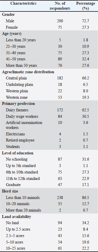 Fig. 1. An overview of the study design, sample size, and key analytical domains of the dairy farm waste perception and practices survey among farmers in Punjab, India. Statistical analysisData collected from the survey were compiled in Microsoft Excel 2010, cleaned for inconsistencies, and further analyzed using SPSS version 25.0 (SPSS Inc., IBM, Armonk, NY, USA). Descriptive statistics, including median, frequency, and percentage, were calculated for demographic and required outcome variables. A total of 10 perception and practice parameters were evaluated using an appropriate scoring system, which was provided in consultation with the University experts based on the correct responses (Supplementary File 2). The scores were then categorized into median, 25th percentile, and 75th percentile. The normality assumption for parametric tests was checked using the Shapiro–Wilk test. The Pearson correlation was used to explore linear relationships between continuous variables (e.g., age and score, education, and score). The independent samples t-test was employed to evaluate the impact of sex on scores. One-way ANOVA was used to compare mean scores across more than two groups (e.g., education levels, age categories, number of animals). Post hoc comparisons (e.g., Bonferroni correction) were employed to identify specific group differences. For the analysis of multiple-response questions related to needs and barriers, the absolute number of respondents who selected each option was converted to a percentage of the total number of respondents who answered the question. Ethical approvalThe required ethical permission for the study was obtained from the Institutional Ethics Committee of Dayanand Medical College and Hospital, Ludhiana, Punjab (Ethical approval number: DMCH/ IEC/2024/316). The participation of the farmers in the study was entirely voluntary, with informed consent obtained from all respondents. Participants were informed of the study objectives and were assured that their personal information would remain confidential and be used solely for research. ResultsThe present study obtained 287 (82%) responses out of 350 targeted surveys, with 275 (78.6%) respondents providing complete information. Twelve surveys with incomplete information were eliminated from the study. Demographic analysisThe demographic profile of the participants included the four agroclimatic zones of Punjab (Table 1). Out of 275 participants, the majority of participants were male (72.7%). The highest number of respondents belonged to the 41–50 age group (32.4%). It was observed that 31.6% of respondents had no schooling. The respondents with a herd size of less than 10 animals were 86.5%, and 34.2% did not have agricultural land. About 62.5% of dairy farmers were actively involved in dairy farming, while other participants were maintaining animals as a secondary source of income. Table 1. Demographic details of respondents.