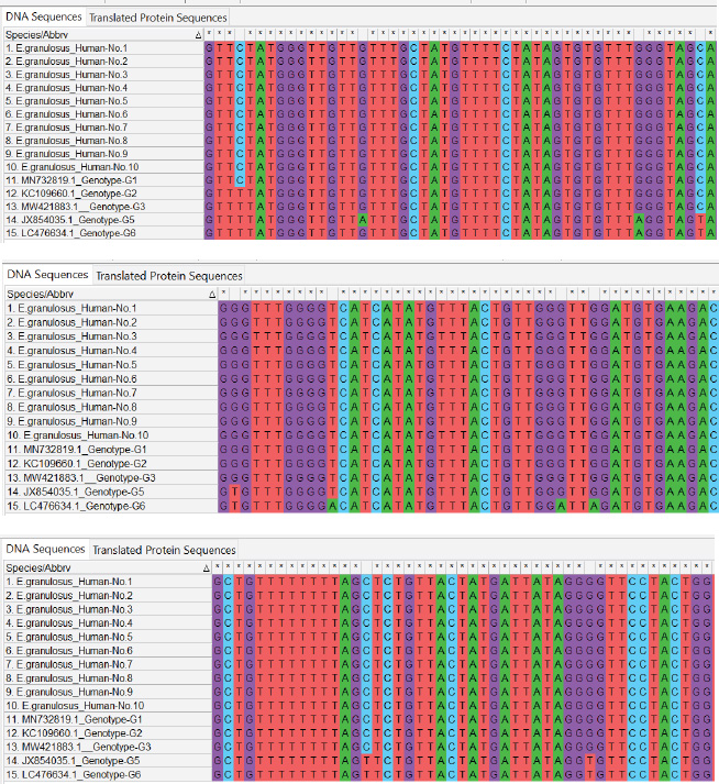 ABSTRACTBackground: Cystic echinococcosis (CE) is a parasitic infection caused by the larval form of Echinococcus granulosus (a member of the Taeniidae family). The infection is spread by fecal-oral contact with infected domestic dogs. CE threatens human health and destroys animal production all over the world. Echinococcus granulosus genotypes need to be correctly identified for better control and prevention. Aim: This study isolated the genotypes of E. granulosus from human, sheep, and cattle samples collected in Iraq using molecular and phylogenetic methods. Methods: Thirty hydatid cyst samples were collected: 10 from human patients in the hospital and 20 from sheep and cattle slaughtered in Al-Diwaniyah province. DNA was extracted using a commercial kit, and PCR amplification of the mitochondrial Cox1 gene was conducted. The amplified products were sequenced, and the sequences were studied using phylogeny. Results: The findings showed three genotypes of E. granulosus (G1, G2, and G3). G1 was more common in human isolates (98.40%–99.70% homology), G1 and G2 were also found in sheep (98.34%–99.70% homology), and G1 and G3 in cattle (98.40%–99.75% homology). Phylogenetic analysis identified a clear clustering of genotypes that belonged to the same host. The G1 genotype was detected as the most common strain that infects people, sheep, and cattle in Iraq. It is highly zoonotic and has the highest economic losses. Conclusion: This study confirmed the presence of three genotypes of E. granulosus in Iraq: G1, G2, and G3. G1 was most common in all hosts, particularly in humans. Phylogenetic analysis revealed that each host had closely related strains. G1 poses a serious public health and economic threat due to its high zoonotic potential. Keywords: Cattle, Echinococcus granulosus, Genotype, Human, Iraq, Sheep. IntroductionEchinococcus is a genus of cyclophyllid cestodes. Adult worms live in the small intestines of definitive carnivorous hosts, including dogs, wolves, and hyenas, whereas juveniles, known as metacestodes, reside in the internal organs of various mammalian intermediate hosts. Overall, there are 37 known Echinococcus species, which are mainly defined based on minute morphological differences from the larval stage; however, only 14 species are considered valid due to the availability of molecular data (Vishniakov et al., 2024). Humans also act as intermediate hosts (Widdicombe et al., 2022). Adult Echinococcus worms cause carnivorous Echinococcosis, while larvae cause hydatid disease in humans, which is a worldwide public health hazard. Echinococcosis is classified under the category of “neglected zoonotic diseases” and has an important socioeconomic and public health impact in many parts of the world, particularly in regions with lower socioeconomic status (Vishniakov et al., 2024). Echinococcosis has been a public health issue since the time of Hippocrates; however, the disease has taken an extra dimension, particularly in China, in terms of its global public health importance. Echinococcosis increases the total number of DALYs caused by parasitic diseases by 19.7% in certain countries (Gholami et al., 2021). The two principal and most widely distributed species of Echinococcus are Echinococcus granulosus and Echinococcus multilocularis. One of the unique and interesting biological features of these groups of Echinococcosis is their capacity to grow and survive in multiple mammalian hosts, particularly in extreme climates and environments, in different parts of the world (Oliveira et al., 2022). Concerning the economic impact, losses have been caused concurrently or consequently by infections with Echinococcosis (Xie et al., 2023). This section deals with the global and regional prevalence. Although the disease is endemic throughout the world with considerable variations in terms of intensity and distribution across countries, Echinococcosis is reported in four continents: Latin America, Asia, Eastern Europe, and Africa (Ali et al., 2024). The distribution pattern of human Echinococcosis closely follows the livestock farming distribution, underpinning the extent of direct and indirect contributions to well-being, poverty alleviation, and socioeconomics, predicated by the direct linkage between climate change and ensuing changes in transhumance patterns and frequency (Hogea et al., 2024). Strengthening intestinal health in people may boost the immune system against hydatid cysts (Gholami et al., 2021; Ghazi et al., 2024). It is of practical significance to control Echinococcosis by blocking related factors through interfering with different links in the development of life cycle infection in intermediate hosts, treatment or immunization of definitive hosts, and preventative measures in parasitic survival and development, which is a comprehensive measure requiring long-term efforts (Omondi et al., 2020; Gholami et al., 2021; Janabi, 2021; Derakhshani et al., 2023; Guo et al., 2023; Almashhadany et al., 2024; Kheninef et al., 2024). This study isolated the genotypes of E. granulosus from human, sheep, and cattle samples collected in Iraq using molecular and phylogenetic methods. Materials and MethodsSamplesThirty hydatid cysts were obtained from three hosts, 10 from human patients receiving surgical treatment for cystic Echinococcosis, 10 from sheep, and 10 from cattle at a slaughterhouse in Al-Diwaniyah province, Iraq. The protocolizes was snipped from the cyst fluid as described by Agha (2015) and stored for molecular analysis. Molecular identificationDNA extractionAll samples were extracted from DNA using a Geneaid Genomic DNA Extraction Kit (Taiwan) according to the manufacturer’s instructions. The purity and concentration of the extracted DNA were measured using a Nanodrop spectrophotometer. All the taken DNA was kept at −20°C until analysis. Polymerase chain reactionPrimer from Nikmanesh et al. (2014) PCR amplification of the mitochondrial Cox1 gene. The prime