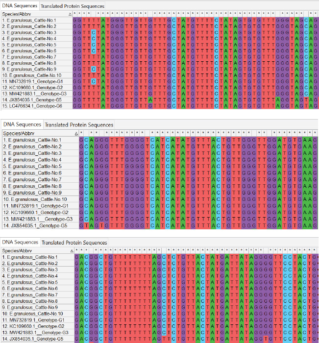 Fig. 4. ClustalW multiple sequence alignment of partial mitochondrial Cox1 gene sequences from local Echinococcus granulosus cattle isolates. This comparison aligned the sequences with the associated E. granulosus genotypes from the NCBI-BLAST database. The alignment indicates areas of homology (marked with stars (*), corresponding to conserved sequences, and genetic divergence between the nucleotide sequences of the cattle isolates. These results illustrate the genetic diversity and conserved elements of the mitochondrial Cox1 gene of E. granulosus. This research also managed to deposit sequences of the local isolates in the NCBI GenBank database, with accession numbers PQ661280, PQ661281, PQ661282, PQ661283, and PQ661284 for sheep, human, and cattle isolates (Figs. 5–7). DiscussionThe current study genotyped E. granulosus strains from humans, sheep, and cattle in Iraq and shed light on the molecular epidemiology of this parasite. The G1 genotype prevails in human isolates (98.40%–99.70% homology), and this has been found in a few international studies. Shahabi et al. (2021) declared G1 to be the predominant genotype in humans in Turkey and Iran and reported that it is of zoonotic importance and widespread incidence. Similarly, Hodžić et al. (2022) identified G1 as the most prevalent genotype in Bosnia and Herzegovina, supporting its worldwide dominance. This dominant position results from close contact between humans and infected animals, notably sheep, which serve as the main intermediate hosts for G1.