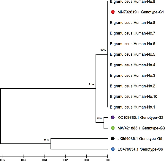 Fig. 5. Phylogenetic tree analysis based on the partial mitochondrial Cox1 sequence of Echinococcus granulosus from local human samples (color-filled circles). This is based on the evolutionary distances and Maximum Composite Likelihood method (UPGMA tree) in (MEGA 6.0 version). By contrast, research by Celik et al. (2024) derived both the G1 and G3 genotypes from human isolates in Turkey, with regional differences in genotype distribution. Moreover, in Bolivia Ali et al. (2020) recorded an expanded range of genotypes from G3 to G7, indicating geographical variation across E. granulosus transmission cycles. These results suggest that although G1 is the global champion, other genotypes, such as G3, also contribute to human infection in certain areas. The identification of the G1 (98.34%–99.65% homology) and G2 (99.30%–99.70%) genotypes in sheep isolates concurs with observations from Turkey (Talladaçalşr et al., 2022) reported G1 as the most common genotype and G2 as a small strain. Similarly, Aziz et al. discovered a preference for the G1 and G3 genotypes in sheep from the US, and these genotypes are common in sheep populations around the world (Jesudoss Chelladurai et al., 2024).