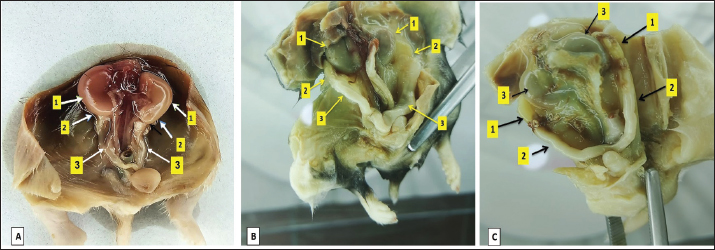 Fig. 1. Illustrates the position of the ovary in the abdominal cavity at different developmental stages: at 2 weeks of age (A), at 4 weeks of age (B), and within the 8-week age group (C). The noticeable changes include variations in the size and positioning of the ovary (2) and oviduct (3) in relation to the kidney (1). Table 1. Dimensional measurements of the left and right ovaries among age groups.