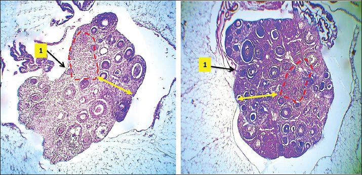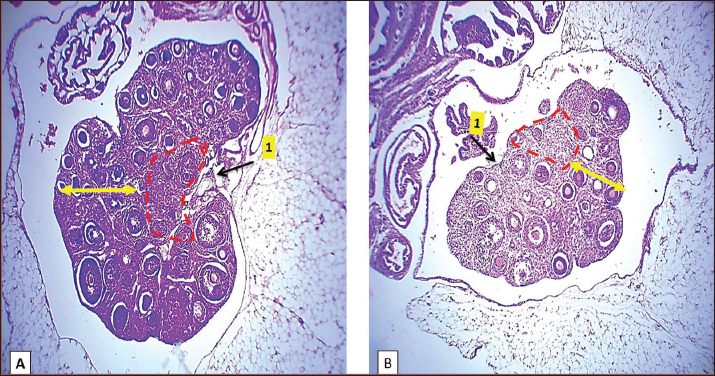 Fig. 6. Microphotograph showing the microscopic structure of the ovary in 4-week age group, The left ovary (A), right ovary (B), medulla (dashed circle), cortex (arrows), ovarian hilum (1), H&E 40X.