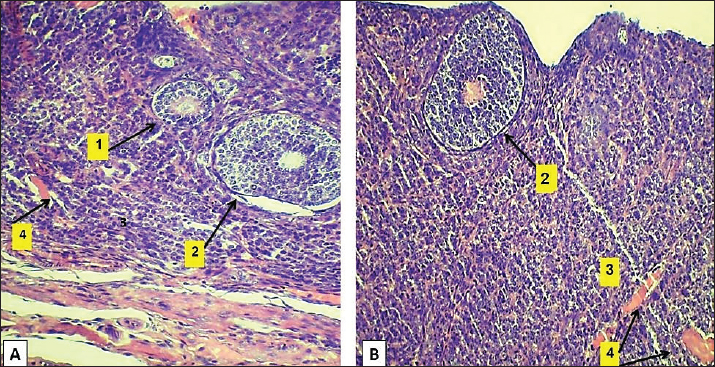 Fig. 3. Microphotograph showing the cortex of the ovary in 2-week-old animals, at the left ovary (A) and right ovary (B). The figure illustrates the primary follicles (1), secondary follicles (2), cortex (3), ovarian blood vessels (4), and H&E 100X. Histologically, the microscopic structure of the ovaries was similar to that of the younger animal group. Single line of simple cuboidal epithelium covering the ovarian surface and the parenchyma filled with progressively developing primordial, primary, secondary, Graafian, and atretic follicles. The number of left ovarian follicles was greater than that of right ovarian follicles (Fig. 7) (Table 2).