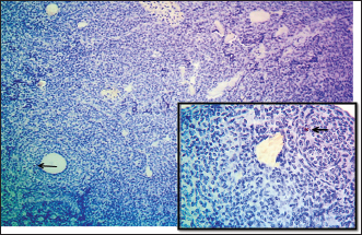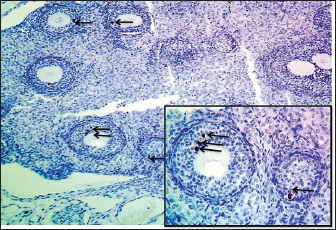 Fig. 5. Microphotograph showing immunohistochemical positive expression of CD40 in T-lymphocytes (arrows) within the ovarian parenchyma of the 2-week age group, IHC 100x (magnified figure 400X).