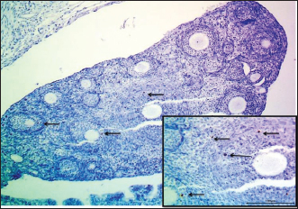 Fig. 12. Microphotograph showing immunohistochemical positive expression of CD40 in T-lymphocytes distribution (arrows) within the ovarian parenchyma of the 8-week age group, IHC 100x (magnified figure 400X). DiscussionThe findings of our study revealed notable morphological changes in the ovaries of dwarf hamsters with age progression. The length, width, and weight of the ovaries increase with age. The right ovary exhibited a bean-like shape, and the left ovary appeared heart-shaped. The ovarian surface remained smooth and later became more lobular (segmented) at 8 weeks of age. These morphological developmental changes are consistent with those of previous studies. For instance, Karimi et al. (2014) reported similar findings in dimensional measurements of golden hamster ovaries, which were consistent with our anatomical data on dwarf hamsters. Moreover, the ovaries of adult hamsters were deeply lobulated and densely occupied with different follicles. Al-Saffar and Al-Ebbadi, (2019), documented rounded ovaries in guinea pigs and found that preovulatory ovary dimensions and weights were comparable to our observations in 2-week-old hamsters. Furthermore, Ozdemir et al. (2005) described porcupine ovaries as smaller bean-like structures with a rough lobulated surface, corresponding to our findings. The differences in ovarian morphology among laboratory animals can be attributed to the inherent biological diversity present across species and reflect the developmental process governing maturity and adulthood in these animals. Furthermore, the current study revealed significant differences in the size and follicular activity between the left and right ovaries within each age group. The right ovaries exhibited a notably larger size compared with their left ovary, with slight variations in weight also observed. Such asymmetry in ovarian characteristics is widely recognized in animals. For instance, McKey et al. (2022) observed higher weight and functional activity in the right ovary of mice compared to the left. Similarly, Karamishabankareh et al. (2015) recorded greater length, width, and weight in the right ovaries of adult Bengal goats. Additionally, Reddy et al. (2005) reported increased follicular activity and size in the right ovary of cows compared with the left. The authors agree that changes in follicular size and growth are closely associated with functionality and development. Histologically, the dwarf hamster’s ovary is surrounded by a single layer of cuboidal cells and overlies fibrous connective tissue called tunica albuginea. The ovarian parenchyma comprises a cortex containing different developing follicles and a highly vascularized medulla. This microstructure is similar to that observed in the ovaries of different rodents, such as the European hamster (Karimi et al., 2014), rabbits (Al-Saffar and Almayahi, 2018), and mice (McKey et al., 2022). The identification of the medulla was clear in 2-week-old animals in this study, while it was not obvious in older animals. Al-Saffar and Almayahi, (2018), also mentioned the same notes in rabbits’ ovaries and attributed this to the small follicles in younger animals compared to the large ones in adult animals. The number of primordial follicles was scant in this age group compared with the other types of follicles, which increased gradually with age, and the primary oocytes were organized in clusters surrounded by stratified epithelium. This observation was confirmed by Reddy et al. (2005) in rats and mice. The number of primary, secondary, and Graafian follicles increased gradually with age, with obvious corpus luteum seen in 4–8 week-old animals. Furthermore, the diameter of the follicles also increased with age. Lo et al. (2019) ascribed this progression to the development and release of mature eggs during ovulation, which plays a crucial role in the reproductive cycle in animals. The critical age of ovarian development in dwarf hamsters extends from 4 to 8 weeks of age, when ovulation is initiated. Takagi et al. (2007) found that the development of the corpus luteum is a characteristic feature after 8 weeks of age in rats, and it is more prominent in the right ovary than the left ovary. The microscopic observations in this study also revealed complete development of the zona pellucida within mature follicles, an increased number of atretic follicles, and an increased depth of the ovarian hilum in 8-week-old hamsters. Similar observations were reported by Picut et al., 2015 in rats at 32 postnatal days (4 weeks old). They ascribed that to the increased sensitivity and responsiveness of the ovaries to the pituitary gland gonadotropins, corresponding to FSH elevation Reddy et al., (2005) also mentioned similar developmental events in the ovary of mice and correlated the understanding of follicular development with the treatment of infertility and oocyte transplantation. The density of T-lymphocytes increased with age and was noticeable within the follicular tissue of 8-week-old animals. Vinatier et al., (1995) suggested that the function of T-lymphocytes increases with age as a result of corpus luteum development and regression, due to the cytotoxic effect on luteal cells and the protective role of T-lymphocytes after ovulation. Bukulmez and Arici, (2000), also mentioned that T-lymphocytes contribute to the regulation of gonadal activity and the modulation of mature follicular rupture by secreting numerous regulatory soluble factors. The challenges in our study of dwarf hamsters stem from their early maturity and seasonal effects, which distinctly conceal these changes. On the other hand, the findings of these studies provide great potential benefits for the use of this model to understand ovarian development in other animals and humans. ConclusionThe current study explained the macroscopic and microscopic morphological development, symmetry between left and right ovaries, and distribution of T-lymphocytes within dwarf hamster ova