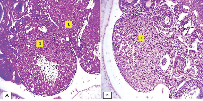 Fig. 11. Microphotograph showing the ovarian cortex in 8-week age group, pointing to the corpus luteum (1), in the left ovary (A), and right ovary (B), H&E 100X.