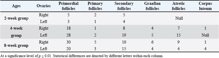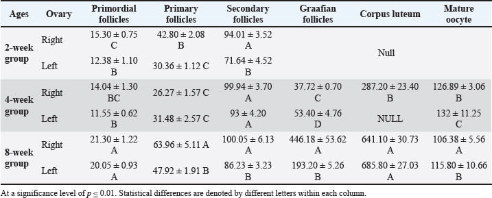 Table 3. Diameters of ovarian follicles and related structures in the left and right ovaries among age groups.