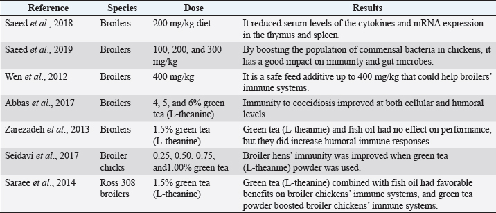 Fig. 4. The effect of the release of some organs and their effects on immune function (Abo-Al-Ela et al., 2021). In addition to cytokines, internal organs such as the Fabricius bursa, thymus, and spleen are all involved in cellular and humoral immunity in poultry, and these immune organs are critical for the development of the poultry immune system (Liu et al., 2014). Therein, the spleen serves as a critical peripheral immune organ, while the thymus and Fabricius bursa serve as central immune organs. The immune organ-to-body weight ratios are frequently examined and used as an indicator for evaluating the poultry’s immune system (Pope, 1991). In broilers, a study discovered that L-theanine at suitable doses considerably increased humoral immunity and tended to raise the thymus and spleen’s relative weights (Wen et al., 2012). L-theanine was observed to lower serum proinflammatory cytokines (IL-2, IL-6, INF-γ, and TNF-α) while increasing serum IgA, IgG, and IgM levels. As a result, L-theanine may be utilized effectively as a feed additive to enhance duck immunological function. ConclusionTo the best of authors’ knowledge, this is one of the first reviews on poultry focusing on immunity by using L-theanine. In poultry species, all studies seem to lack information on the immunomodulatory mechanism of L-theanine and information on the dose of L-theanine in the diet and/or drinking water to boost immunity. In addition, limited investigation of L-theanine supplementation in poultry and its effects on poultry immunomodulation are major barriers for further research to investigate antistressor functions in the improvement of immunity. As some recommended previously, 200 g/kg L-theanine is generally a good choice to improve immunity in poultry. In addition, this study recommended that future studies should focus on the function of L-theanine in poultry immunity to determine a proper supplementation for poultry in both drinking and diet. Table 1. Positive results of L-theanine in immunity.