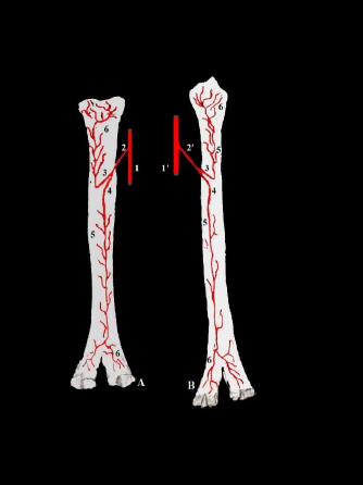 Fig. 6. Presented blood supply of metacarpus (A), metatarsus (B) showing, (1) common metacarpal artery, (1ʹ) common metatarsal artery, (2) nutrient artery of metacarpus, (2ʹ) nutrient artery of metatarsus, (3) proximal nutrient branch, (4) distal nutrient branch, (5) metaphyseal branch, and (6) epiphyseal branch. The distal extremity of metatarsal bones of Mc III and IV (Figs. 1Aʹ; 2Bʹ; 3Cʹ; and 4Dʹ,9) is smaller than the metacarpal bones and are situated on some level. The sagittal notch is intertrochlear split (Figs. 1Aʹ; 2Bʹ; 3Cʹ; and 4Dʹ,11) divided the distal extremity into two trochlea, each trochlea divides into two condyles (Figs.1Aʹ; 2Bʹ; 3Cʹ; and 4Dʹ, 12,13; 5,3), each condyle is smooth dorsally and divides by the intercondylar ridge; palmary (Fig. 4Dʹ,18) into two area abaxial (Fig. 5,1) and axial areas (Fig. 5,2). The small metacarpal Mc II and V are represented by two ridges on either side of the planter surface of the large metatarsal bones. The biometrical observations on the different parameters of the metacarpus and metatarsus showed few simple differences between the male and female camel. The average length of the metacarpal and metatarsal in males was 367 mm, while in females was 370 mm. The maximum diameter of the proximal extremity, shaft, and distal extremity in the male metacarpal bone was 80, 35, and 65 mm, respectively, while it was 75, 32, and 64 mm. The maximum diameter of the proximal extremity, shaft, and distal extremity in the male metatarsal was 72, 35, and 53 mm, while in females the measurements were about 64, 32, and 55 mm. The maximum width of the lateral condyle and medial condyle in the male metacarpal bone was 30 and 35mm and in females was about 36 and 38 mm. The maximum width of the lateral condyle and medial condyle in males’ metatarsal bone was 32 and 34 mm and was 32 and 35 mm in females (Tables 1, 2, 3 and 4). Table 1. Morphometric metacarpus of camel males.