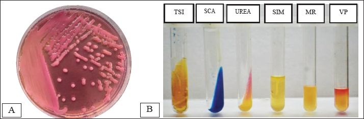 Fig. 1. Isolation and identification of the bacteria. (A) Colony of K. pneumoniae bacteria on MCA; (B) Biochemical test. Table 3. Identification of antibiotic resistance against K. pneumoniae isolates in layer and free-range chicken shells.