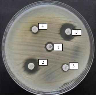 Fig. 3. Results of the MDR K. pneumoniae bacteria test. Description: 1. Amoxicillin; 2. Tetracycline; 3. Streptomycin; 4. Erythromycin; 5. Ciprofloxacin. Table 5. The resistance pattern of MDR K. pneumoniae.