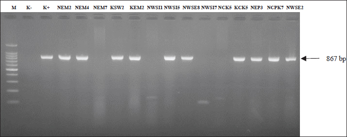 The results of antibiotic resistance tests on K. pneumoniae isolates from chicken egg shell swabs from traditional markets in Surabaya found that isolates that were resistant to 3 or more can be called MDR, 34.14% (14/41). The occurrence of MDR in K. pneumoniae isolates from chicken egg shell swabs was found with a percentage of 78.57% (11/14), whereas that in K. pneumoniae isolates from chicken egg shell swabs was found with a percentage of 21.42% (3/14). The highest percentage of MDR occurred in Manyar market, 100% (4/4), followed by Simo 75.00% (3/4), Keputran market 66.66% (2/3), Sememi 33.33%, Pucang 25.00% (1/4), Pacar Keling 20.00% (1/5), and the lowest percentage by Wonokromo market 14.28% (1/7) (Table 4). The MDR K. pneumoniae isolate is shown in Figure 3. The MDR isolate was specifically detected for the presence of the ESBL gene blaSHV at the genetic level through PCR testing. The resistance pattern of K. pneumoniae in traditional markets in Surabaya City showing the occurrence of MDR, is presented in Table 5. The occurrence of MDR in K. pneumoniae isolates with the highest to lowest resistance patterns included AML/S/E, there are 7 samples (7/14; 50%), consisting of NCPK code 7, KCK 5, NWSE 8, NWSI 1, NEM2, KEM2, and NEP3. Next, followed by AML/E/CIP of two samples (2/14; 14%) consisting of NWSE2 and NWSI5. Then, ATM/S/E/CIP of (2/14; 14.28%) was calculated. Furthermore, AML/TE/S/E (NEM4), AML/TE/E/CIP (KSW2), and AML/TE/S/E/CIP (NCK5) each resistance pattern has one sample (1/14; 7%). Based on the results of this study, there were 10 out of 14 K. pneumoniae isolates from MDR from eggshell swabs of Ras and Buras chickens showing a positive band at 867 base pairs (bp); thus, 71.42% (10/14) of K. pneumoniae isolates from MDR had the ESBL blaSHV gene (Fig. 4). The sample codes that were positive for the blaSHV gene included: NEM2, NEM4, KSW2, KEM2, NWSI5, NWSE8, KCK5, NEP3, NCPK7, and NWSE2. Negative sample codes included NEM7, NCK5, NWSI1, and NWSI7.