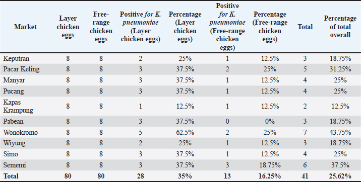DiscussionThe results of isolation and identification showed that 41 positive samples (25.62%) were identified as K. pneumoniae bacteria. Positive samples consisted of 28 swabs of layer chicken egg shells (68.29%) and 13 swabs of free-range chicken eggs (31.70%). The results of this study were higher than those previously conducted on egg samples from laying hen farms in Punjab, India; 11 (4.58%) were positive for K. pneumoniae from the litter cage system, and 7 (2.91%) from the battery cage system (Khehra, 2022). Research conducted by Permatasari et al. (2020) in Blitar, Indonesia, found K. pneumoniae contamination (3.87%) in cloacal swabs from laying hen farms. In another study conducted in Indonesia, the incidence of K. pneumoniae (7.8%) was recorded in chicken cloacal swabs (Hayati et al., 2019). Research by Aly et al. (2014) studied chick droppings and found K. pneumoniae contamination (10%) in their study. Differences in the research results may be influenced by the type of samples, such as feces, intestinal contents, or eggshells, which can affect bacterial isolation outcomes. Additionally, small sample sizes or inconsistent sampling techniques can lead to variations in the research results (Kahin et al., 2024).