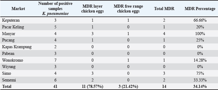 ABSTRACTBackground: Contamination with Klebsiella pneumoniae in food ingredients, including eggs, causes various dangers because it threatens public health, because it acts as a multidrug resistance (MDR) bacteria, especially the extended-spectrum beta-lactamase (ESBL) strain. The ESBL blaSHV gene is part of a broad-spectrum ESBL that is often found in Gram-negative bacteria. Aim: This study aimed to identify the ESBL blaSHV gene in K. pneumoniae MDR from chicken eggshells. Methods: This study used 160 samples of chicken eggshell swabs isolated on 1% BPW media from 10 traditional Surabaya markets. Samples were isolated using MCA media and were identified using Gram staining and biochemical tests. Detection of MDR using Muller-Hinton Agar. Results: Confirmation of ESBL in multidrug-resistant (MDR) isolates was performed using polymerase chain reaction to detect ESBL genes. The results showed that the isolation and identification of K. pneumoniae bacteria were 25.62% (41/160). Amoxicillin antibiotics showed the highest level of resistance at a percentage of 100% (41/41), followed by antibiotic resistance to erythromycin (90.24% (37/41), Streptomycin antibiotics were 26.82% (11/41), ciprofloxacin (14.63% (6/41), and Tetracycline antibiotic resistance was 7.31% (3/41). The results of MDR from K. pneumoniae showed 34.14% (14/41) of the isolates were then tested by PCR, which showed positive results for the blaSHV gene of 71.42% (10/14). Conclusion: The data from this study confirm the existence of K. pneumoniae bacteria isolated from egg shell swabs carrying the blaSHV gene from MDR isolates. Keywords: K. pneumoniae, MDR, ESBL, public health, egg shell. IntroductionA major global public health concern is food safety because dangerous microbes in food can cause a wide range of illnesses (Widodo et al., 2023; Kendek et al., 2024). Eggs are one of the food components that are commonly contaminated, even though eggs are a significant source of nutrition that delivers high-quality protein, necessary amino acids, vitamins, and minerals, and may be obtained in traditional markets and supermarkets (Kuang et al., 2018). Klebsiella pneumoniae is one of the bacteria that can infect eggs (Kahin et al., 2024). According to research by El Ftouhy et al. (2022), contamination of chicken egg shells by Klebsiella spp. in traditional markets and supermarkets was 24% and 4%, respectively. The contamination of chicken eggs by K. pneumoniae in traditional markets may result from both vertical and horizontal transmission (El Ftouhy et al., 2022). Additional research has demonstrated that agricultural surroundings, farm worker swabs, and egg swab samples are contaminated with K. pneumoniae bacteria (Dela et al., 2023). Gram-negative K. pneumoniae bacteria, which are members of the Enterobacteriaceae family, are frequently found on water surfaces, garbage, plants, soil, and other environmental surfaces. They can produce infectious agents in both humans and animals (Dameanti et al., 2023). Klebsiella pneumoniae is one of the bacteria that is resistant to a number of medications worldwide (Riwu et al., 2022). The prevalence of K. pneumoniae-related resistance has increased to 70% worldwide, and the mortality rate from infections has also increased to 40%–70% (Bradley and Scoular, 2021). According to recent studies, K. pneumoniae isolates have been identified as extensively drug-resistant (XDR) and produce extended-spectrum β-lactamase (ESBLs) and carbapenemases (Owaid and Al-Ouqaili, 2025). Although rarely recognized as a cause of foodborne illness, the presence of resistant and potentially virulent K. pneumoniae in food can pose health risks. This bacterium can be transmitted directly or spread resistance genes to other bacteria in food or the human gut (Hartantyo et al., 2020). One of the most urgent concerns for global public health in the twenty-first century is antimicrobial resistance (AMR) (Ferdinand et al., 2024). AMR is the result of an evolutionary process in which bacteria, fungi, viruses, and parasites develop resistance to antimicrobial medications, such as antibiotics, which are frequently used to treat infections (Salam et al., 2023). Contamination of food products with resistant bacteria occurs because animals and plants that serve as food sources for humans can act as vectors for the transfer of antimicrobial-resistant bacteria and AMR genes to humans. In addition, direct contact between humans and infected animals or environments, or with biological substances they produce, such as blood, urine, feces, saliva, and semen, can contribute to an increase in AMR (Chang et al., 2015). One of the various ways that bacteria develop resistance to antibiotics is by transferring resistance genes through plasmids (Benz et al., 2021; Khairullah et al., 2024). The genes blaSHV, blaTEM, and blaCTX-M are found on the chromosome or plasmid and regulate the β-lactamase enzyme manufacturing (Effendi et al., 2018; Pourhossein et al., 2020). The ESBL enzyme, which is commonly found in K. pneumoniae, is responsible for 20% of plasmid-mediated penicillin group resistance, specifically SHV (Yuwono, 2013). The Gram-negative bacteria Enterobacteriaceae produce extended-spectrum beta-lactamases, which are enzymes that hydrolyze penicillins as well as first, second, and third-generation cephalosporins and the aztreonam group (Ansharieta et al., 2021). These enzymes are inhibited by beta-lactamase inhibitors such as clavulanate, sulbactam, and tazobactam (Ghafourian et al., 2015). Hussein et al. (2024) concluded that the high levels of antibiotic resistance observed in K. pneumoniae isolates, particularly those categorized as multidrug-resistant (MDR), XDR, and pandrug-resistant, are influenced not only by β-lactamase production, such as ESBL and metallo-β-lactamase, but also by the overexpression of efflux pump genes and reduced outer membrane permeability due to porin loss. These combined mechanisms significantly enhance 