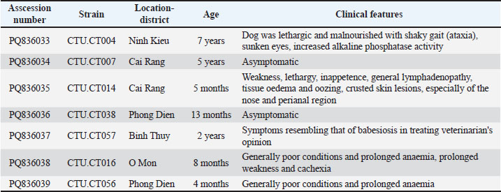 AbstractBackground: Hepatozoon canis (H. canis) is an intracellular protozoan parasite transmitted by ingestion of infected ticks. It is responsible for canine hepatozoonosis, a disease that affects the health and well-being of dogs worldwide. The infection can range from subclinical to severe, depending on the host’s immune status and parasite burden. Hepatozoon canis has been reported in multiple regions, but data on its prevalence and genetic characteristics in Vietnam, particularly in Can Tho City, remains limited. Aim: To determine the infection rate and genetic characteristics of H. canis in dogs in Can Tho City, Vietnam. Methods: A total of 359 suspected cases of H. canis presented to veterinary hospitals between January and November 2024 were investigated. Molecular diagnosis was performed using polymerase chain reaction, and positive samples were sequenced. The resulting sequences were compared with reference H. canis strains in GenBank to assess genetic similarity and variation. Results: The overall infection rate of H. canis was 0.75% and 9.47% among the surveyed dogs and suspected cases, respectively. Genetic analysis showed high similarity (98.88%–100%) between the three local and global reference strains. Four high-entropy loci were observed: 208 (G→A), 217 (T→C), 450 (C→T), and 474 (C→T), with the highest entropy at position 450 (0.682), suggesting regional genetic variation and potential selective pressure. Transition bias analysis revealed a strong preference for pyrimidine transitions (T↔C), indicating conservation in key regions. Conclusion: To the best of our knowledge, this is the first comprehensive genetic characterization of H. canis in dogs in Can Tho City. Despite a low prevalence of infection, genetic analysis revealed significant local variation. These findings enhance our understanding of the molecular epidemiology and evolution of H. canis and emphasize the need for further studies to elucidate the clinical implications of genetic polymorphisms. Keywords: Molecular epidemiology, Hepatozoon canis, Tick-borne pathogen, 18S rRNA gene, Vietnam. IntroductionHepatozoon canis, first identified in India in 1905, is a tick-borne apicomplexan protozoan that infects domestic and wild canids across diverse geographic regions, including Asia, Africa, and Europe (Baneth, 2011; Miterpáková et al., 2017). All Hepatozoon spp. share a basic lifecycle, involving sporogonic development in a hematophagous invertebrate host, followed by gametogenesis and sporulation in a vertebrate intermediate host (Baneth et al., 2007). Hepatozoon canis sporozoites spread via the blood and lymphatic system to several organs, including the spleen, bone marrow, lungs, liver, and kidneys, infecting leukocytes and parenchymal tissue cells (Vásquez-Aguilar et al., 2021). Hepatozoonosis generally manifests in a chronic form, with no established correlation between the age of affected dogs and H. canis infection. The geographic distribution of H. canis infection is closely associated with Rhipicephalus sanguineus (R. sanguineus), the most widely distributed tick species globally (Giannelli et al., 2013). In Vietnam, the prevalence of tick infestation in dogs was reported at 29.01%, with the brown dog tick (R. sanguineus) being the predominant species (Do et al., 2024), posing a risk for the spread of canine vector-borne diseases, especially under tropical conditions favorable for tick proliferation. Although H. canis has been reported in various countries, molecular and epidemiological data remain limited in Vietnam. According to Nguyen et al. (2021), the prevalence of H. canis in Ho Chi Minh City was 11.33%; however, comprehensive studies in the Mekong Delta have not yet been conducted. This study aimed to investigate the prevalence of H. canis among clinically suspected dogs and to genetically characterize local strains using partial 18S rRNA gene sequencing, given the lack of molecular data from Southern Vietnam, particularly in Can Tho City—a central hub of the Mekong Delta. These findings will help elucidate the genetic diversity and potential epidemiological patterns of H. canis in this region. Materials and MethodsStudy area and samplingDogs exhibiting clinical signs consistent with blood-borne parasitic infections—such as fever, anorexia, lethargy, emaciation, muscle atrophy, anemia, and pale mucous membranes—were initially examined at participating veterinary hospitals in Can Tho City from January to November 2024. The inclusion criteria encompassed dogs presenting with at least two of the aforementioned clinical signs during clinical examination. A total of 359 dogs that met these criteria were enrolled for further testing. Blood smear was examined on all enrolled dogs as an initial screening method to evaluate hemoparasites, although molecular testing was prioritized due to its limited sensitivity. Subclinical cases—dogs lacking observable symptoms—were excluded from this study. Whole blood (2 ml) was collected from each dog via cephalic venipuncture, placed in EDTA K3 anticoagulant tubes, stored in a refrigerated container, and transported to the Faculty of Veterinary Medicine, Can Tho University, for molecular analysis. Hematological data, such as red blood cell count, hemoglobin concentration, and platelet count, were not available for all animals; therefore, anemia was assessed based on mucous membrane pallor. Platelet counts were not systematically evaluated due to resource constraints. This clarification provides transparency regarding the inclusion criteria, screening methods, and limitations of hematological diagnostics. Molecular detection and characterization of H. canisGenomic DNA was isolated from whole blood samples of dogs using a TopPURE® RNA/DNA Viral Extraction Kit (ABT, Vietnam). The DNA sample was eluted in 50 μl of EB buffer, and the concentration of the pure DNA was determined using a NanoDrop™ 2000 spectrophotometer (Thermo Scientific™)