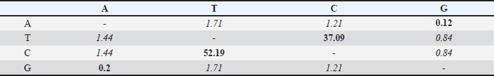 Fig. 3. Color-code matrix of pairwise identity scores generated by the alignment of nucleotide sequences of the gene 18S rRNA region of H. canis strains isolated in Can Tho city in Mekong Delta, Vietnam and representative isolates from other countries. Sequences identified from dogs in this study are marked in lemon yellow. Specifically, the sequences of strains CTU.CT004, CTU.CT007, and CTU.CT014 showed 100% nucleotide identity with partial sequences from dogs in Peru (OQ451891), Spain (AY461378, AY731062), Sudan (DQ111753, DQ111757, DQ111759), Israel (MH615006, MK091085), Uruguay (OR814221), Serbia (MZ930460), India (MF797806), Taiwan (EU289222, JF459994), Thailand (MW402990-MW402992), as well as sequences from H. canis isolated from cats in Israel (KC138531, KC138532), foxes in Italy (KP715301), and R. sanguineus ticks in Turkey (MW684291, MW684292). In contrast, the CTU.CT38, CTU.CT7, CTU.CT16, and CTU.CT56 strains demonstrated 99.6%–100% nucleotide similarity with the sequences isolated from dogs in Brazil (KF972441, KF972443) and India (KU527126). They also shared identity with sequences from isolates found in other animals, including cats (MW377923, MW377924), Prionailurus bengalensis (MZ151528), Muntiacus feae (MZ151527), and Elephas maximus (MZ151504, MZ151505, MZ151509, MZ151512, MZ151513, MZ151518, MZ151520, MZ151522) in Thailand, as well as ticks (KF972445, KF972442) in Brazil. These findings indicate the presence of at least two H. canis sublineages circulating in Can Tho. Furthermore, the studied strains were clustered into separate clades and shared 99.1%–99.3% nucleotide identity with the PP373785 strain isolated from R. sanguineus in Northern Vietnam, indicating intra-national genetic variability. However, the lowest nucleotide identity (98.3%–98.9%) was observed between sequences in this study and isolates from dogs in China (OP699208), India (KU096058, MH922768, and KU527127), and isolates from foxes (KY021181, KU893118–KU893126) in the Czech Republic. This reflects possible regional evolutionary divergence and adaptation. Each entry shows the substitution probability (r) from one base (row) to another base (column) (Kumar et al., 2018). The sum of the r values was normalized to 100. Transition substitutions were predominant, especially between pyrimidines (T↔C), which were notably high. Nucleotide frequencies were 27.68% (A), 32.80% (T/U), 23.31% (C), and 16.21% (G) (Table 3). The transition/transversion rate ratios were k1=0.138 (purines) and k2=30.585 (pyrimidines). The overall transition/transversion bias was R=9.519. This indicates a strong preference for transitions, especially T↔C, contributing to the genetic stability of the 18S rRNA gene. Table 3. This section presents the Maximum Composite Likelihood Estimate (MCLE) of nucleotide substitution patterns for the 18S rRNA gene of H. canis.