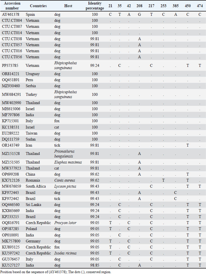 Fig. 4. Nucleotide sequences of partial 18S rRNA for H. canis isolates determined in this study were aligned with the published 18S rRNA sequences of the H. canis isolates in Spain (AY461378) as a reference and representative isolates from other countries. A dot indicates a conserved nucleotide relative to the published sequence. The nucleotide sequences of the partial 18S rRNA sequences of H. canis isolates from Can Tho (PQ836033–PQ836039) were aligned with a reference sequence from Spain (AY461378). The field strains CTU.CT38, CTU.CT7, CTU.CT16, and CTU.CT56 exhibited a nucleotide variation at position 208 (G→A), leading to a sequence similarity of 99.81% (534/535). This localized mutation may indicate genetic drift or regional adaptation among the Can Tho H. canis population. DiscussionThe findings of this study reinforce the widespread prevalence of H. canis in dogs in Vietnam and its association with several epidemiological factors. The absence of a significant relationship between infection status and age, sex, or rearing method aligns with the findings of previous studies (Licari et al., 2017; Çelik et al., 2022). These results indicate that H. canis infection is influenced by broader ecological factors, such as tick exposure, rather than confined to a particular demographic or management practice. Similarly, no association was found between rearing methods and infection rates, which may be attributed to the widespread presence of brown ticks in Vietnam (Do et al., 2024). Table 4. Alignment of partial sequences of 18S rRNA gene and position of variable sites.