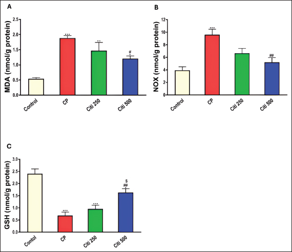 Fig. 3. Impact of citi on oxidative injury and antioxidant suppression caused by CP in lung tissue homogenates: The impact of oral daily citi treatment (250, 500 mg/kg) for 14 days with a single i.p. injection of CP (200 mg/kg) on day 7 on: A. MDA; B. NOx; C. GSH. The mean ± SEM is used to express data. n=6. ***p < 0.001, ** p < 0.01, * p < 0.05 versus the control; ## p < 0.01, # p < 0.05 versus the CP group; $ p < 0.05 versus the citi 250 group. CP: cyclophosphamide, citi: citicoline, MDA: malondialdehyde, NOx: total nitrate/nitrite, GSH: reduced glutathione.