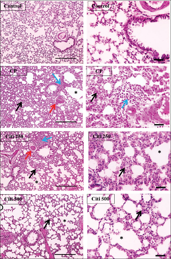 Fig. 6. Effect of citi on CP-induced histopathological lung damage: CP induced thickening of the alveolar wall (black arrow) with numerous inflammatory cell infiltrations (blue arrows), together with hemorrhage and congestion. This condition is associated with arterial hypertrophy (red arrow) and emphysema (*). Meanwhile, the deleterious manifestations of CP were dose-dependently mitigated by citi treatment. Lung sections were stained with H&E. Low magnification ×:100 bar 100 and high magnification ×:400 bar 50. CP: cyclophosphamide, citi: citicoline, H&E: Hematoxylin and eosin. This study demonstrated that CP induced inflammation by increasing the release of proinflammatory cytokines, including TNF-α, IL-6, and IL-1β. This phenomenon may be ascribed to the activation of neutrophils and macrophages, which discharge free radicals and proteolytic enzymes, finally resulting in damage to connective tissues (El-Kashef, 2018). Consistent with other studies (Badawi, 2022; Balaha et al., 2023). Treatment with citi effectively reduced elevated cytokine levels. This beneficial effect may be mediated by its ability to inhibit phospholipase A2, an enzyme implicated in neuroinflammation, which consequently reduces ROS production and the release of proinflammatory cytokines (Adibhatla and Hatcher, 2003). The NF-κB signaling system is crucially activated by oxidative stress and is critical to cell survival, inflammation, and immunological responses. This transcription factor governs the synthesis of several inflammatory cytokines. In standard settings, the NF-κB p65 subunit is associated with its inhibitor, IκBα, and additional IκB proteins, creating an inactive complex in the cytoplasm. Upon activation, IκBα is phosphorylated, resulting in the activation and subsequent translocation of NF-κB p65 into the nucleus, where it promotes the production of inflammatory genes (El-Agamy et al., 2018). Numerous studies have emphasized the critical role of NF-κB activation in mediating the inflammatory response associated with CP-induced lung injury (Balaha et al., 2023; Salama et al., 2023). Interestingly, citi has been shown to significantly inhibit NF-κB activation, resulting in a marked reduction in downstream inflammatory cytokines, such as NOx, TNF-α, and IL-6. Research has suggested that citi can modulate NF-κB signaling in various inflammatory conditions, including diabetes-induced retinal neurodegeneration and γ-radiation-induced splenic inflammation (Bogdanov et al., 2018; Abdel-Aziz and Saif-Elnasr, 2024). Additionally, citicoline may enhance ACh activity by increasing the expression of choline acetyltransferase and α7 nAChR. Furthermore, phosphatidylcholine is considered an agonist of α7nAChR (Conant and Schauss, 2004). Activation of α7nAChR reduces IκBα degradation, preventing nuclear translocation of NF-κB and subsequent expression of proinflammatory cytokines (Mizrachi et al., 2021). The NLRP3 inflammasome consists of proteins containing nucleotide binding domains and leucine-rich repeat sequences, the adaptor protein apoptosis-associated speck-like protein containing a CARD (ASC), and procaspase-1 (Schroder et al., 2010). The phosphorylation-induced nuclear translocation of NF-κB p65 activates the NLRP3 inflammasome, resulting in elevated levels of IL-1β and IL-18. Various endogenous and exogenous stimuli trigger a secondary signal that promotes the assembly of NLRP3, ASC, and procaspase-1 into a complex (Yang et al., 2019). This activation results in the maturation of caspase-1, which then cleaves the proforms of IL-1β and IL-18 into their active forms (Vanaja et al., 2015). Previous studies have shown that CP triggers the activation of NLRP3 (Lin et al., 2020; Zhang et al., 2021). In this investigation, we noted that CP dramatically enhanced the expression of NLRP3 and caspase-1 in the NLRP3 inflammasome pathway in the lung tissues of rats treated with CP. Nonetheless, these effects were significantly mitigated by the administration of citi. Our research suggests that the antiinflammatory properties of citi in alleviating lung toxicity may be partly due to the suppression of the NLRP3 inflammasome pathway. These findings correspond with earlier studies indicating that citi may mitigate inflammatory responses by suppressing the NLRP3 inflammasome or other elements of this pathway (Silva-Palacios et al., 2022). ConclusionIn summary, citi exerted a protective effect against CP-induced lung injury, primarily through its antioxidative and anti-inflammatory properties. Therefore, citi is a potential option for lung damage management associated with CP treatment. AcknowledgmentsNone. Conflict of interestThe authors declare that they have no conflicting interests. FundingThis study was not funded. Authors’ contributionsGehad El-Sayed, El-Said El-Sherbini, and Mohamed El-Adl: study design and supervision. Rania Salah: experimental work, data collection, statistical analysis, and writing of the original draft. Gehad El-Sayed, El-Said El-Sherbini, and Mohamed El-Adl: reviewing and editing the article. Data availabilityThe manuscript contains all the data that support the study’s conclusions. ReferencesAbdel-Aziz, N., Moustafa, E.M. and Saada, H.N. 2021. The impact of citicoline on brain injury in rats subjected to head irradiation. Environ. Sci. Pollut. R. 28(8), 9742–9752. Abdel-Aziz, N. and Saif-Elnasr, M. 2024. Citicoline modulates inflammatory signaling pathways in the spleen of rats exposed to gamma-radiation. Immunopharmacol. Immunotoxicol. 46(4), 564–571. Abdel-Salam, O., Youness, E., Mohamed, N., El-Moneim, O. and Shaffie N. 2019. Citicoline protects against tramadol-induced oxidative stress and organ damage. React. Oxyg. Species. 7(20), 106–120. Adibhatla, R.M. and Hatcher, J.F. 2003. Citicoline decreases phospholipase A2 stimulation and hydroxyl radical generation in transient cerebral ischemia. J. Neurosci. Res. 73(3), 308–315. Ahmed, L.A., El-Maraghy, S.A. 