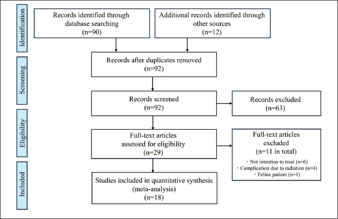 Fig. 1. PRISMA flow diagram. Statistical analysisFor all 70 dogs, the diagnosis, fracture location, treatment type, implant used for stabilization, and adjuvant therapy data were summarized using standard descriptive statistics. Survival time and functional prognosis were analyzed using the Kaplan–Meier method. For the meta-analysis, statistical evaluation of the subgroup analysis comparing postoperative adjuvant chemotherapy (presence vs. absence) was conducted using the log-rank test. Differences were considered statistically significant at p< 0.05. Statistical graphics, including pie charts and Kaplan–Meier curves, were generated to illustrate the descriptive analysis, survival time, and functional prognosis for each group. All statistical analyses were performed using EZR software (Kanda, 2013), based on the R Project for Statistical Computing (R Foundation for Statistical Computing, Vienna, Austria). Ethical approvalNot needed for this study. ResultsPatients and fracture characteristicsSeventy dogs met the inclusion criteria. Osteosarcoma was the most common cause of pathological fractures (n=55; 78.6%), followed by multiple myeloma (n=3; 4.3%), undifferentiated sarcoma (n=3; 4.3%), bone metastases from prostate carcinoma and transitional cell carcinoma (n=2; 2.9%), bone cyst (n=2; 2.9%), osteomyelitis (n=2; 2.9%), fibrosarcoma (n=1; 1.4%), discospondylitis (n=1; 1.4%), and avascular necrosis (n=1; 1.4%) (Fig. 2A). Pathological fractures most commonly occurred in the appendicular skeleton, including the femur (n=18; 25.7%; classification: proximal, n=8; diaphyseal, n=5; distal, n=5), humerus (n=16; 22.9%; classification: proximal, n=9; diaphyseal, n=1; distal, n=6), radius (n=15; 21.4%; all distal), and tibia (n=11; 15.7%; all distal). Less frequently affected sites included the thoracic spine (n=2; 2.9%, vertebral body), lumbar spine (n=2; 2.9%, vertebral body), cervical spine (n=1; 1.4%, vertebral body), ulna (n=1; 1.4%, distal), metacarpus (n=1; 1.4%), and calcaneus (n=1; 1.4%) (Fig. 2B). Among the breeds, Rottweilers (n=16), Greyhounds (n=6), mixed-breed dogs (n=5), German Shepherds (n=5), Golden Retrievers (n=4), and Labrador Retrievers (n=4) were most affected by pathological fractures. Therapeutic interventionsThe most common therapeutic intervention was surgical stabilization (n=40; 57.1%), followed by euthanasia (n=20; 28.6%), amputation (n=5; 7.1%), chemoradiotherapy (n=2; 2.9%), palliative care (n=1; 1.4%), and partial removal (n=1; 1.4%) (Fig. 2C). The surgical techniques used included plate stabilization (n=20; including arthrodesis, 28.6%), followed by interlocking nails (n=13; 18.6%), external fixation (n=4; 5.7%), and spinal fixation (n=3; 4.3%) (Fig. 2D). The mean follow-up duration was 302 days.