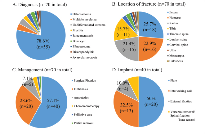 Fig. 2. Descriptive analysis results. Clinical data from 70 cases are summarized using pie charts. (A) The cause of the pathological fracture, (B) the affected location, (C) clinical management, and (D) the type of implant used at the time of surgery. Functional prognosis and complicationsThe long-term postoperative follow-up of functional prognosis was available for 21 patients, with a median time to lameness occurrence of 163 days (95% confidence interval (CI): 130–510 days) (Fig. 3A). Subgroup analysis of implant types revealed no significant differences between plates and interlocking nails (p=0.415). Postoperative complications included local infections (n=4), local recurrence (n=3), implant fractures (n=2), and implant-induced fractures (n=1). Survival analysisFor osteosarcoma cases, long-term follow-up was possible in 28 patients, with a median survival time of 292 days (95% CI: 163–518 days) (Fig. 3B). Of these, 14 received adjuvant therapy (radiation therapy with or without chemotherapy, including carboplatin, doxorubicin, and cisplatin), while the other 14 received no treatment (n=14) (Fig. 3C). Subgroup analysis showed no significant differences in survival between the adjuvant therapy and non-therapy groups (p=0.675) (Fig. 3D). DiscussionPrevious retrospective studies have reported that the median survival time for canine osteosarcoma is 4 to 6 months with amputation alone (Mauldin et al., 1988; Straw et al., 1991) and approximately 12 months with amputation and chemotherapy (Morello et al., 2011). In terms of life expectancy, survival following pathological fracture repair is shorter than that observed with amputation and chemotherapy. These findings suggest that repair surgery for pathological fractures, particularly in load-bearing bones of the extremities, may serve as a palliative treatment option for owners who decline amputation, as well as for dogs with progressive diseases, including metastatic lesions. Additionally, repair surgery may be considered in cases of malignant progression of localized disease, which can lead to poor pain control. In such cases, repair surgery for pathological fractures can be considered as a surgical option. In the present study, multiple patients were euthanized after experiencing pathological fractures. These findings suggest that palliative treatment for pathological fractures may be beneficial, as it allows for moderate gait function and offers a relatively promising survival time. The absence of significant differences between cohorts with or without adjuvant therapy may be attributed to type II error.
