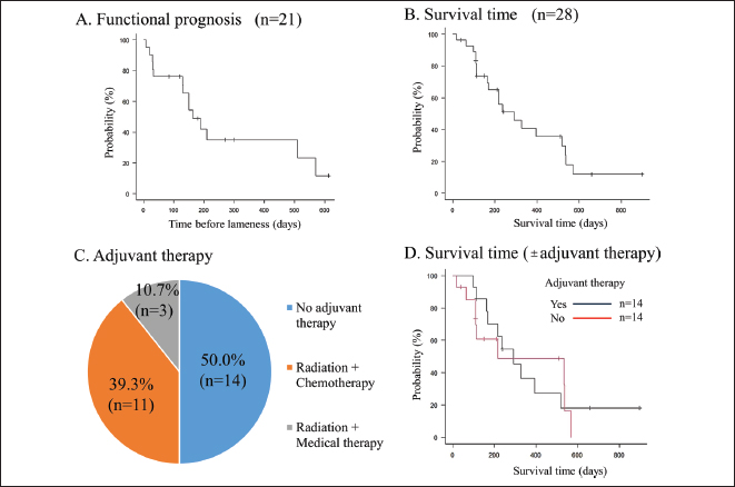 Fig. 3. (A) Kaplan–Meier curves illustrate functional prognosis after surgery, defined as the number of days from fracture repair until lameness is observed, as evaluated by orthopedic veterinarians. Tick marks indicate censoring events, such as euthanasia or natural death. (B) Kaplan–Meier curves depicting survival analysis for patients with osteosarcoma, with tick marks indicating censoring events, such as euthanasia. (C) Pie chart showing subgroup analysis results comparing cohorts with or without adjuvant therapy. (D) Kaplan–Meier curves comparing functional prognosis between patients who received adjuvant therapy (black line) and those who did not (red line). A discrepancy was observed between the median time to lameness and the median survival time. This indicates that pain management is essential for maintaining quality of life during the months when limb function is impaired. Pain control strategies may include the use of nonsteroidal anti-inflammatory drugs, opioids, bisphosphonates, and novel analgesics. In this regard, we are currently developing a new drug candidate that targets osteoclast precursor cell fusion to suppress abnormal bone remodeling (unpublished data). This therapy may improve the prognosis of canine patients. Regarding complications, the risk of infection is negligible in tumor-associated orthopedic surgeries, such as limb-sparing procedures, as reported in previous studies (Morello et al., 2001; Morello et al., 2003; Ehrhart, 2005; Liptak et al., 2006; Hodge et al., 2011). The use of currently available silver-coated implants—featuring an ultrathin antimicrobial coating with pure elemental silver particles embedded in a biocompatible plasma polymer—may be necessary to mitigate infection-related complications in future studies (Azab et al., 2016; Engel et al., 2024). The potential for bone healing following surgical stabilization of pathological fractures remains a subject of ongoing debate. Hayes et al reported a case of complete bone regeneration after plate fixation of a pathological femoral fracture caused by sarcoma (Hayes et al., 2020). Progressive bone healing in such cases is likely influenced by a complex interplay of anatomical, mechanical, and biological factors, including regional variations in vascular supply (Shah et al., 2025a; Shah et al., 2025b). To preserve periosteal and intraosseous vascularity, we advocate the use of minimally invasive osteosynthesis with interlocking nailing or minimally invasive plate osteosynthesis. This study has some limitations. Due to the nature of the meta-analysis, follow-up data were limited. In addition to our cases, we incorporated clinical information from published case reports and case series, some of which lacked follow-up data, although a high percentage of our cases included follow-up data. Furthermore, because case reports and case series were integrated, clinical and statistical heterogeneity were not assessed. Clinical heterogeneity arises from variations in patient backgrounds, diagnostic tests, and treatments across studies. In contrast, statistical heterogeneity reflects the degree to which it is reasonable to assume that the effect sizes from all studies represent the same population effects. Additionally, reporting bias may have influenced the findings, as studies with positive results are more likely to be published than those with negative results (Stern and Simes, 1997). In conclusion, this study demonstrates the clinical efficacy of repair in pathological fractures, highlighting the functional prognosis and survival time following the procedure. Reduction and stabilization surgery for pathological fractures may serve as a third treatment option in addition to limb-sparing surgery and amputation. AcknowledgmentsWe thank Dr Daniel A Degner, DVM, Diplomate ACVS (small animal), Animal Surgical Center of Michigan, 5045 Miller Rd, Flint, MI 48507, USA for the data presentation. FundingThis research received no specific grant. Authors’ contributionsConceptualization: K.N.; Data curation: K.N., D.S.; Formal analysis: K.N., D.S.; Investigation: K.N., D.S.; Methodology: K.N.; Visualization: K.N., D.S.; Writing-original draft: K.N.; Writing - review & editing: D.S., M.A., K.B. Conflict of interestThe authors declare no conflict of interest. Data availabilityThe datasets used and analyzed in the current study are available from the corresponding author upon reasonable request. ReferencesAzab, M.A., Allen, M.J. and Daniels, J.B. 2016. Evaluation of a silver-impregnated coating to inhibit colonization of orthopaedic implants by biofilm forming methicillin-resistant Staphylococcus pseudintermedius. Vet. Comp. Orthop. Traumatol. 29, 347–350. Banks, T., Langova, V. and Straw, R. 2003. Repair of three pathologic fractures in a dog with multiple myeloma. Aust. Vet. Practit. 33, 98–102. Bhandal, J. and Boston, S.E. 2011. Pathologic fracture in dogs with suspected or confirmed osteosarcoma. Vet. Surg. 40, 423–430. Boston, S.E., Bacon, N.J., Culp, W.T., Bhandal, J., Bruce, C., Cavanaugh, R.P., Hamilton, M.H., Lincoln, J.D., Liptak, J.M. and Scharvogel, S. 2011a. Outcome after repair of a sarcoma-related pathologic fracture in dogs: a Veterinary Society of Surgical Oncology Retrospective Study. Vet. Surg. 40, 431–437. Boston, S.E., Barry, M. and O’Sullivan, M.L. 2011b. Transtumoral plating as a novel method for palliative limb spare and thromboembolism in a dog with a distal radial primary bone tumor. Can. Vet. J. 52, 650–655. Boston, S.E., Vinayak, A., Lu, X., Larue, S., Bacon, N.J., Bleedorn, J.A., Souza, C.H.M. and Ehrhart, N.P. 2017. Outcome and complications in dogs with appendicular primary bone tumors treated with stereotactic radiotherapy and concurrent surgical stabilization. Vet. Surg. 46, 829–837. Cabassu, J. and Moissonnier, P. 2007. Surgical treatment of a vertebral fracture associated with a haematogenous osteomyelitis in a dog. Vet. Comp. Orthop. Traumatol. 20, 227–230. Cha