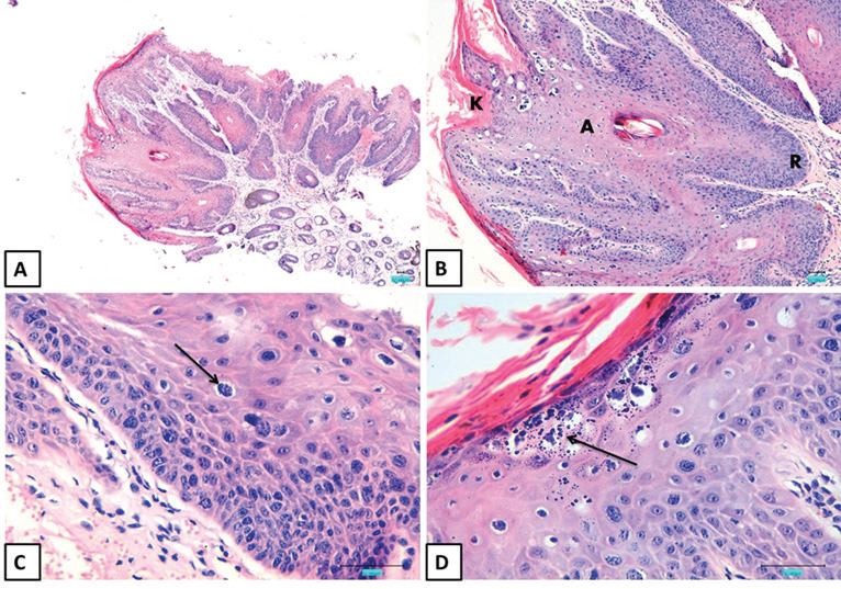 Fig. 2. H&E-stained sections of equine skin mass (bar=50 μm). (A) The exophytic mass is located on the skin surface. (B) The mass consists of proliferating keratinocytes, featuring elongation of the rete ridges (R), acanthosis (A), and hyperkeratosis (K). (C) Koilocytes are multifocally present within the epidermis (arrow). (D) Keratohyaline granules within the stratum granulosum are abundant and exhibit variability in size and shape (arrow). Histopathological analysisHistopathological examination of the collected specimens revealed characteristic exophytic papillomatous masses demonstrating significant thickening and hyperplasia across all layers of the epidermis (Fig. 2A). This was evidenced by the presence of elongated and expanded rete ridges, pronounced acanthosis, and orthokeratotic hyperkeratosis (Fig. 2B). The mitotic activity was minimal, with only 1–2 mitotic figures observed per high-power field. A notable feature was the presence of numerous koilocytes within the stratum spinosum and stratum granulosum. These cells were distinguished by their large size, slightly eccentric nuclei, and the presence of a clear perinuclear halo (Fig. 2C). Additionally, keratohyaline granules within the stratum granulosum were markedly enlarged and exhibited variability in shape and size, further confirming the diagnosis of papillomatosis (Fig. 2D).