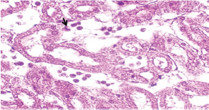 Fig. 7. A histopathological section of kidney of (G2) at 14 days postinfection showing tubular infiltration with parasitized mononuclear cells (black arrow) (H&E stain X 40).