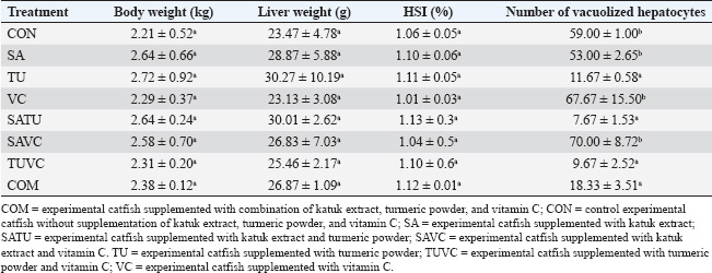 Analysis dataThe histology and liver pictures data were provided descriptively in the figures. Growth- and reproductive-related data were collated in MS. Excel 2010 (Microsoft, USA) and statistically evaluated using one-way ANOVA in SPSS ver. 25 (IBM, USA). The SD was determined to define the range of means, and the p value was set to 0.05 to test for significant results. Mean values were determined using Tukey’s test. Ethical approvalAll animal experiments were conducted under the guidelines of the animal ethics commission of the School of Veterinary Medicine and Biomedical Sciences, IPB University, number 059/KEH/SKE/VI/2023 has approved procedures for handling and caring experimental animals. ResultsBody weight, liver weight, hepatosomatic index, and liver histologyObservation of body weight, liver weight, and HSI values at the end of 8 weeks of rearing of experimental catfish with the addition of katuk extract, turmeric powder, and vitamin C are presented in Table 2. The results observation of body weight were in the range of 2.21–2.29 kg, liver weights were in the range of 23.13–30.27 g, and HSI values were in the range of 1.01%–1.13%, and those results were statistically not significant among treatments. Even though the HSI of experimental catfish were not statistically different, the highest HSI value was found at SATU (combination of administration of katuk extract and turmeric powder) treatment with an average value of 1.13% ± 0.02%, and the lowest value was found at VC (administration of vitamin C) treatment with an average value of 1.01% ± 0.03%. Histological observation of the liver tissue of the experimental catfish was conducted to evaluate any indications of damage to the liver cells during the vitellogenesis process (Fig. 1). Histological examination of catfish liver tissue is essential in understanding fish’s reproductive dynamics and liver health. Compared with the liver tissue of catfish after the administration of katuk extract, turmeric powder, and vitamin C, hepatocyte cells experienced necrosis. In each treatment group, several cells experienced hepatocyte vacuolization (VAC), such as in the CON, SA, VC, and SAVC groups. In treatment with the addition of turmeric powder, many hepatocyte cells did not experience VAC. By supplementing feed with the addition of turmeric powder, the histological appearance showed that fewer cells experienced hepatocyte VAC. Based on statistical testing, the number of liver cells that experienced VAC showed a significant difference (p < 0.005) between treatments. The lowest number of VAC cells was observed in the SATU treatment (7.67 ± 1.53), and the highest number was observed in the SAVC treatment (70.00 ± 8.72). This indicates that supplementing turmeric powder in the experimental catfish feed during vitellogenesis can improve liver cell functions and increase the synthesis capacity of liver cells to produce vitellogenin, which is the raw material for egg yolk formation in catfish larvae. Table 2. Body weight, liver weight, hepatosomatic index (HSI), and number of vacuolized hepatocytes in experimental catfish supplemented with katuk leaf extract, turmeric powder, and vitamin C.