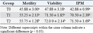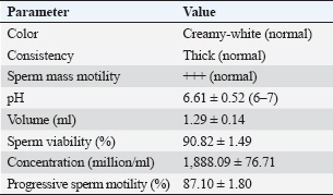 Table 3. Kacang buck spermatozoa motility, viability, and IPM (%) in egg yolk milk extender with or without EGCG after post-equilibration (5°C, 1 hour).