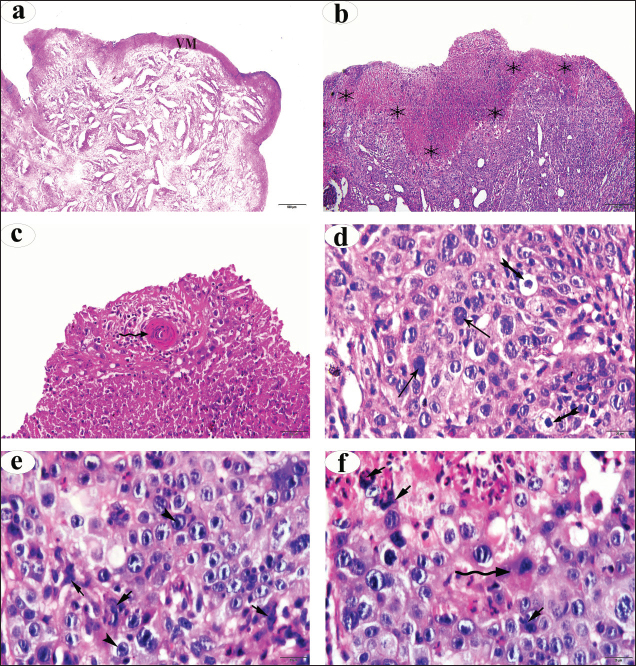 Fig. 2. (a): Photomicrographs of normal vaginal mucosa stained with H&E. (b) & (f) photomicrographs of vaginal SCC stained with H&E. Vaginal mucosa (VM), squamous cell invasion The present macroscopic analysis of the diseased cows indicated that the tumor had spread and caused significant infiltration in the vulva and vagina, which was linked to surface ulceration and purulent infection. Similar findings were reported in a previous study involving sheep, which showed that SCC was observed at the vulvar mucocutaneous interface and that the tumor progressed with widespread infiltration in the vulva and vagina. Additionally, the tumor was associated with purulent infection and surface ulceration (Del Fava et al., 2001). Usually starting on the vulva’s hairless, lighter-colored skin, SCC in the genital area resembles SCC in appearance and behavior when it develops in other places (Foster, 2007). Purulent infections are common in the reproductive tract, particularly after parturition and during the postpartum period. It has been reported that metritis and placental retention are predisposing factors for the incidence of purulent infection in dairy cattle (Amin et al., 2021a). It can be noted in the current study that tumor development in the vagina is associated with purulent exudate, suggesting that tumor affection, particularly in dairy animals that undergo pregnancy and parturition regularly, is a predisposing factor that facilitates purulent infection.