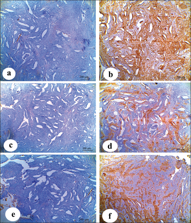 Fig. 3. (a–f) Photomicrographs of cow’s vaginal sections immunostained with vimentin (a, b), S100 (c, d), and α-SMA (e, f); control group (a, c & e) showed negative reaction while SCC-infected cow’s (b, d & f) showed strong positive reaction. (IHC, scale bar=200 μm). It was announced that steroid hormones play a role in the development of some types of cancer. It has been stated that experimental evidence indicates the presence of a link between steroid hormones, human Papillomavirus (HPV), and cervical cancer. Previous studies in humans have revealed that lesions linked to HPV have altered patterns of steroid hormone receptor expression (Gao et al., 1983; Monsonego et al., 1991). Estrogen is one of the most important steroid hormones that play significant roles in female reproductive life. In the current trial, its examination indicated its high concentration in the VSCCG compared with the NCG. Similarly, it was stated that estrogen plays a role in the development of HPV16 in SiHa cervical carcinoma cells as it stimulates the transcription of this type of tumor (Mitrani-Rosenbaum et al., 1989). In an alternative HPV transgenic mouse model, the endogenous viral promoter maintained control of the high-risk HPV18 E6 and E7 oncogenes. Estrogen stimulated the expression of E6 and E7, which are associated with a greater degree of cervical dysplasia (Park et al., 2003). These findings support the theory that estrogen plays a crucial role in genital cancer. Similarly, in the current study, the development of vaginal tumors may depend on an increase in the secretion of steroid hormones such as estrogen and progesterone. Progesterone is one of the most important hormones, and its evaluation indicates the fertility status of animals. The increase referred to physiological conditions such as pregnancy and pathological conditions such as abortion (Amin et al., 2023) and pyometra (Amin et al., 2021b), while the decrease referred to cases of failure of reproduction such as inactive ovaries (Amin and Said, 2021). Progesterone detection in the current study revealed its high concentration in VSCCG compared with that in NCG. These findings are similar to those previously reported in cases of cows with luteoma in which P4 secretion was high due to the presence of tumors that caused the cows to exhibit anestrosis (Grunert, 1999). It has been reported that P4 plays a role in the development of tumors resulting from papillomavirus. Many studies have indicated that P4 receptors regulate the expression of the HPV by triggering the viral promoter found in the body and assisting high-risk HPV in undergoing cellular transformations (Gloss et al., 1987; Pater et al., 1988; Pater et al., 1994). The pituitary gland produces an important glycoprotein hormone known as FSH. FSH production and/or its signaling pathways are disrupted in several reproductive diseases. In the current study, FSH and LH concentrations were significantly increased in diseased cows compared with normal healthy cows. Several theories have been proposed to explain the causes of cancer that may develop in the reproductive system. The gonadotropin hypothesis is an important one. Numerous transgenic or knockout animal models that display hypergonadotropism with high levels of circulating FSH and LH comparable to the postmenopausal state in women have been found to develop ovarian cancers (Risma et al., 1995; Keri et al., 2000). In addition, increasing evidence indicates that the hormonal environment is responsible for the development and progression of ovarian surface epithelium and ovarian epithelial cancer cells. Granulosa cell tumors (GCTs) have been shown to grow in transgenic mice with persistently increased LH, an analog of which is frequently utilized in fertility regimens (Keri et al., 2000). Therefore, a later study indicated that gonadotropin may be involved in the pathogenesis of GCT. In our study, the significant increase in FSH and LH levels in the affected patients could be attributed similarly to this gonadotropin hypothesis. In the context of clinical investigations, elevated levels of APPs in patients with various malignancies could function as prognostic or diagnostic markers. It is interesting to note that a variety of cancer types have the ability to express APPs, which may have an impact on metastasis, treatment resistance, and cancer progression (Orr et al., 2011). Prior research documented the emergence of the APP response in a variety of tumor types, including human breast cancer and canine mammary cancers (Szczubiał et al., 2004; Machado et al., 2015). In certain oncologic diseases, APPs have also been shown to be clinically useful biomarkers (Selting et al., 2000; Tamamoto et al., 2013). To the best of our knowledge, this is the first study to thoroughly assess the APP responses of VSCC. It is interesting to note that the findings of this study, regarding the significantly elevated Hp in VSCC-affected cows compared to controls, may be the first to address Hp as a biomarker for the condition. Hp is an important factor in the pathophysiology of cancer (Naryzhny and Legina, 2021) and serves as a prognostic biomarker for non-small-cell lung cancer (Arredouani et al., 2003; Tai et al., 2017). The main role of Hp is to bind free hemoglobin that has been liberated from erythrocytes, thereby preventing its oxidative activity (Yang et al., 2003). Moreover, the importance of Hp as a clinically valuable metric for assessing the frequency and intensity of inflammatory reactions in cattle with diverse illnesses has been previously demonstrated (Eckersall, 2000a). A previous study on acute puerperal metritis reported that Hp concentrations were significantly higher in puerperal metritis cows than in healthy cows (Chan et al., 2010). Furthermore, the data obtained in recent years suggest that APPs may be used as early predictors or risk factors for some diseases, such as metritis. Cows with Hp concentrations >1 g/l on day 3 post