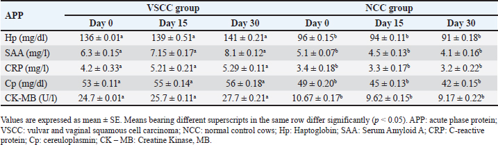 Table 2. Acute phase protein (APP) response in cows with vulvar and vaginal squamous cell carcinoma compared with control cows.
