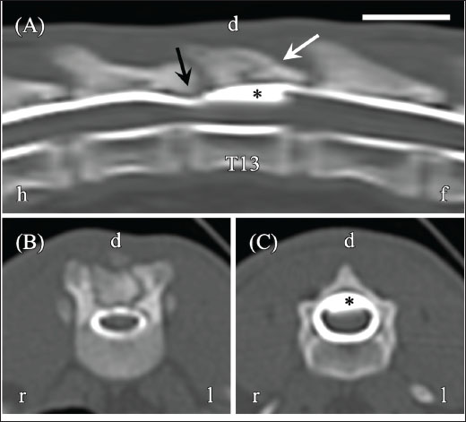 Fig. 1. Computed tomography (CT) myelography of the thoracolumbar vertebrae obtained 4 months prior (day−118). (A) Reconstructed sagittal CT myelography shows dorsal compression of the spinal cord (black arrow), a T13 vertebral fracture (white arrow), and teardrop-shaped fluid accumulation (asterisk) at the dorsal aspect of T13. (B) Transverse image at the T12–T13 level demonstrates spinal cord flattening. (C) Transverse image at the T13 level shows fluid accumulation (asterisk) compressing the dorsal spinal cord. Images were acquired using a bone tissue window (window width, 3,000 HU; window level, 500 HU). Orientation markers: h=head, f=foot, r=right, l=left. Scale bar=1 cm. Four months later, the cat was referred to the Iwate University Veterinary Teaching Hospital for evaluation of surgical suitability (day 1). On presentation, the cat was alert and exhibited ataxia in both pelvic limbs. Neurological examination showed loss of postural responses and decreased sensation of superficial pain in the pelvic limbs, along with lumbar spinal tenderness. Spinal reflexes were unremarkable. The neurological status of the cat corresponded to a grade 4 modified Frankel score (MFS) (Levine et al., 2006). The lesion was clinically localized to the T3–L3 spinal cord segments. Thoracic and abdominal radiographs revealed no abnormalities. MRI was performed using an AIRIS Vento 0.3-T scanner with a knee coil (Fujifilm, Tokyo, Japan) under general anesthesia. Sequences acquired included the following: T2-weighted sagittal and transverse sequences [repetition time (TR), 3000 ms; echo time (TE), 120 ms; slice thickness, 2.5 mm; gap, 0 mm; field of view (FOV), 300 mm; matrix, 256 × 256; number of excitations (NEX), 8]; T1-weighted sagittal and transverse sequences (TR, 300 ms; TE, 15 ms; slice thickness, 2.5 mm; gap, 0 mm; FOV, 300 mm; matrix, 256 × 256; NEX, 5); pre- and post-gadolinium (Omniscan; GE Healthcare) (dose, 0.1 mmol/kg; delay after injection, approximately 1 minute); and fluid-attenuated inversion recovery (FLAIR) sagittal and transverse sequences (TR, 9,000 ms; TE, 100 ms; slice thickness, 2.5 mm; gap, 0 mm; FOV, 300 mm; matrix, 256 × 256; NEX, 2). The total imaging time was 100 min. MRI revealed a lesion on the dorsal aspect of the T13 spinal cord that appeared hyperintense on T2-weighted images (T2WI) (Fig. 2A and C) and hypointense on both T1-weighted and FLAIR images (Fig. 2B and D). The lesion measured 6.0 mm × 5.0 mm × 18.3 mm and showed no enhancement following gadolinium intravenous administration. These findings indicated a fluid-filled lesion; however, it was not possible to determine whether the lesion was intramedullary or intradural–extramedullary.