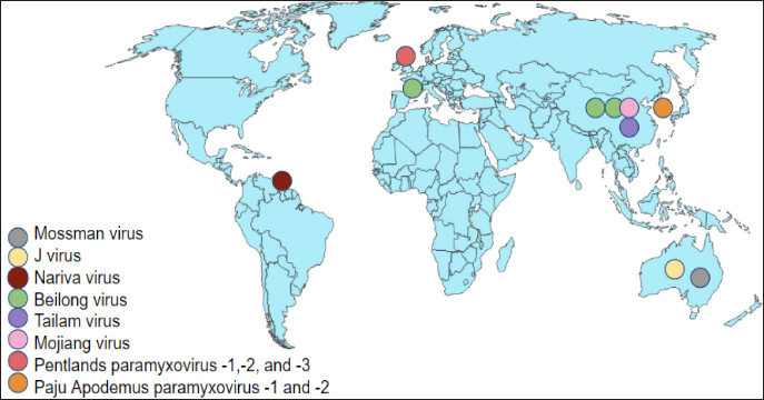 Fig. 1. Epidemiological distribution of unclassified paramyxoviruses. Table 1. Epidemiological distribution of emerging paramyxoviruses in rodents.