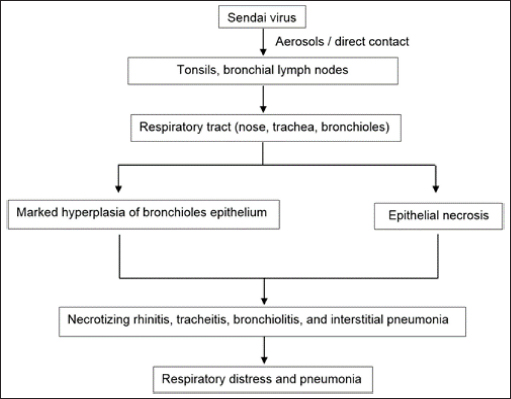 Fig. 2. Pathogenesis of SeV infection in rodents. Clinical manifestationsThe SeV also known as murine parainfluenza virus-1 has been associated with respiratory sickness in laboratory mice, rats, hamsters, and in guinea pigs (Barthold et al., 2016). Table 2 summarizes the clinical signs of paramyxovirus infection in rodents. Animals like other rodents (guinea pigs, beavers, squirrels, etc.), and lagomorphs (rabbits, etc.) are frequently infected with viruses that are mild or asymptomatic (MacLachlan et al., 2011). Cytotoxic T lymphocytes assault virus-infected cells during infection at the "immune" phase, resulting in lesions in respiratory tracts including necrotizing rhinitis, tracheitis, bronchiolitis, and interstitial pneumonia, among other manifestations. Clinical indications manifest themselves in completely immunocompetent animals, with various degrees of morbidity and death according to the age, strain, and immunocompetence of the animals involved. Instead of pathognomonic immune-mediated necrotizing bronchiolitis, nude mice develop long-term progressive interstitial pneumonia, a type of chronic lung infection (Ward et al., 1976). Furthermore, rats infected by SeV produce fewer litter sizes and poor pup development (Kling, 2011). Enzootic infection in rats can manifest itself in two distinct ways: as enzootic (subclinical) infection or as epizootic (clinical) as discussed by Nicklas et al. (2012). The development of latent infection follows an enzootic pattern. Mice in breeding colonies obtain infection promptly after weaning due to low levels of antibodies in the maternal serum after birth. The pattern of the epidemic, on the other hand, is often acute, contributing to increased morbidity and mortality, with almost all susceptible animals getting infected within a short period of time. Between 2 and 7 months after the virus is initially introduced to a colony, sick animals might die or become sub-clinically infected. Diagnostic Methods of Paramyxoviruses InfectionSerological diagnosisSeV infection in rats is best diagnosed by Indirect Enzyme-Linked Immunosorbent Assay (ELISA) or Multiplexed Fluorometric ImmunoAssay due to their sensitivity to detect the early and low antibody titers (Kling, 2011). Rothenburger et al. (2015) used an ELISA with minimal alterations to detect respiratory infections in rats. Serum samples from 139 rats were tested for the bovine respiratory syncytial virus, a pneumovirus related to murine pneumonia virus, and the bovine parainfluenza virus 3, a virus related to the SeV. The results revealed that lysed Vero cells infected with these isolates generated partially purified antigens, with lysed uninfected Vero cells acting as a positive control. No evidences for the rat coronavirus, SeV or murine pneumonia virus were found. However, the negative finding is possibly due to the small sample size employed in the testing. In laboratory rodent colony settling, ELISA and immunofluorescence techniques are most commonly used (MacLachlan and Dubovi, 2017). Antibodies can be detected 7 days after infection, and their presence is often linked to the beginning of immune-mediated necrotizing bronchiolitis and pneumonia. The presence of the virus is further confirmed by the immunofluorescence or immunohistochemical staining of infected monolayers in the embryonated eggs or a variety of cell culture methods including monkey kidney, Vero, and BHK-21 cells with trypsin in the culture conditions. Table 2. Clinical signs of paramyxoviruses infection in rodents.