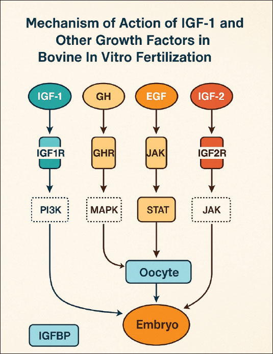 Fig. 1. Mechanism of action of IGF-1 and other factors in bovine IVF. In addition to IGF-1, several other growth factors also play a synergistic role in supporting the success of bovine IVF. Although IGF-2 is more dominant in early embryonic development, it can interact with IGF1R and the IR to stimulate cell growth (Lewitt and Boyd, 2019). growth hormone (GH) acts both directly through the GHR by activating the JAK/STAT pathway and indirectly by increasing IGF-1 synthesis in somatic cells in culture media (Dehkhoda et al., 2018). Epidermal growth factor (EGF) activates the MAPK/ERK pathway through the epidermal growth factor receptor, which plays a role in cumulus expansion, oocyte nuclear maturation, and increasing embryonic developmental competence (Turathum et al., 2021). The combination of IGF-1, GH, and EGF stimulation can produce a synergistic effect that improves the efficiency of oocyte maturation and fertilization. Liver cell culture as an IGF-1 sourceIGF-1 is a polypeptide with a structure that resembles insulin (Bailes and Soloviev, 2021). As a modulator of the actions of growth hormones, IGF-1 plays a crucial role in the regulation of metabolism, stimulation of protein synthesis, and cell growth and development (Al-Samerria and Radovick, 2021). Additionally, IGF-1 promotes the development of bones, muscles, and organs (Ahmad et al., 2020). The complex process of IGF-1 synthesis in liver cells includes transcription, translation, PTM, and growth hormone activation (Poreba and Durzynska, 2020). The primary regulator of IGF-1 synthesis in hepatocytes, or liver cells, is GH, which is generated by the anterior pituitary gland (Al-Samerria and Radovick, 2021). Hormone-releasing hormones such as growth hormone-releasing hormone (GHRH) stimulate GH release, whereas somatostatin inhibits it (Pech-Pool et al., 2020). Once it has reached the liver cells, GH attaches itself to GH receptors on the hepatocyte membrane. As a result of this interaction, signal transduction pathways, including the proteins Signal Transducer and Activator of Transcription 5 (STAT5) and JAK2 (Janus kinase 2), are activated (Furth et al., 2011). STAT5 phosphorylation results from JAK2 activation. Following phosphorylation, STAT5 moves into the cell nucleus and attaches itself to a response element in the IGF-1 gene promoter (Khan et al., 2025). This process increases the transcription of the IGF-1 gene. Chromosome 19 contains the bovine IGF-1 gene (Werner, 2023). Although hepatocyte cultures may serve as a potential source of IGF-1, prior purification, standardization, and bioactivity validation are required to ensure its effectiveness and safety. Further studies are required to evaluate the feasibility of this approach. A transcription complex comprising RNA polymerase II and other transcription factors is formed at the start of the transcription process (Liu et al., 2013). The produced transcript is called IGF-1 messenger RNA (mRNA) (Kasprzak and Szaflarski, 2020). Intron splicing and the attachment of a 5’ cap and poly-A tail at the 3’ end are among the processing steps that the freshly generated mRNA will undergo (Huang et al., 2023). The stability of mRNA and its subsequent translation are dependent on this. Following processing, IGF-1 mRNA makes its way to the ribosome, where protein synthesis occurs (Iresjö et al., 2022). Ribosomes use amino acids carried by tRNA to convert the mRNA sequence into an IGF-1 polypeptide chain (Bastide and David, 2018). Following synthesis, the IGF-1 polypeptide undergoes post-translational modification, which results in the production of the active form of IGF-1 through protein cleavage (Bikle et al., 2015). Furthermore, transport proteins such as IGFBPs frequently bind to IGF-1, modifying its biological function and enhancing its stability in the bloodstream (LeRoith et al., 2021). IGF-1 production increases in nutrient-rich environments, particularly those high in glucose and amino acids, and decreases in nutrient-deficient environments (Caputo et al., 2021). Cattle undergoing IVF benefit greatly from the production and release of IGF-1, which is largely dependent on the liver (Velazquez et al., 2008). Studies using hepatic cell cultures, which are generated from liver tissue, have shown that IGF-1 is produced. These growth factors are secreted into the culture environment after being expressed by hepatic cells (Kang et al., 2012). IGF-1 generated from liver cell cultures can be introduced to oocyte and embryo culture media to assist several crucial processes in fertilization and embryo development (Carrillo-Gonzalez et al., 2024). IGF-1 aids in the growth and maturation of oocytes (Yang et al., 2019). IGF-1 can enhance the quality and pace of oocyte maturation when it is introduced to the culture medium of cow’s oocytes (Barrera et al., 2023). The success of IVF is increased when mature, high-quality oocytes have a higher chance of fertilizing (Fanton et al., 2023). IGF-1 can aid in the growth of embryos after fertilization (Mehtaet al., 2013). One of the primary roles of IGF-1 is to promote cell division and embryo growth, which raises the likelihood that an embryo will survive the culture process (Lin et al., 2003). When IGF-1 is present in the culture media, it is more likely that embryos will develop properly and be prepared for transfer into a surrogate cow’s uterus (Annes et al., 2023). Additionally, IGF-1 contributes to the development of the ideal culture conditions for oocytes and embryos (Fernandez-Gonzalez et al., 2021). Cultured liver cells can contribute extra elements that promote cellular development and proliferation, aid in the creation of superior culture media, and boost the effectiveness of the IVF procedure (Hu and Li, 2015). Other growth factors, including growth hormone and reproductive hormones, work in concert with IGF-1 (Blum et al., 2018). A sufficient amount of IGF-1 in culture can amplify the beneficial effects of other hormones, the