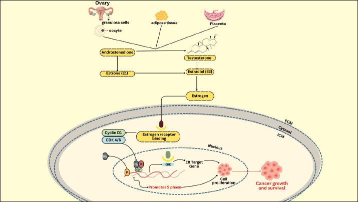 Fig. 3. E2 and ER signaling pathway mediated. The cholesterol-binding protein (StAR; Steroidogenic Acute Regulatory protein) transports cholesterol, the primary precursor for the synthesis of steroid hormones, into the mitochondria (Christenson and Strauss, 2000). Low-density lipoprotein (LDL) and very low-density lipoprotein attached to the cell membrane provide cholesterol for granulosa cells to absorb (Zhang et al., 2023). The cytochrome P450scc (CYP11A1) enzyme transforms cholesterol into pregnenolone in the mitochondria (McCarty et al., 2024). Pregnenolone, a steroid, serves as the starting point for estrogen production (Manna et al., 2016). Enzymes such as 17α-hydroxylase (CYP17A1) and 3β-hydroxysteroid dehydrogenase (3β-HSD) aid in the conversion of pregnenolone to progesterone and then to androstenedione (Miller and Auchus, 2011). The enzyme aromatase is essential for estrogen production because it transforms androgens, such as testosterone and androstenedione, into estrogen (Chan et al., 2016). Granulosa cells in the cumulus oophorus use aromatase to convert androstenedione into estradiol (Liu et al., 2021). Many variables strictly control the estrogen production in cumulus oophorus. FSH promotes GC proliferation and estrogen synthesis (Wu et al., 2022). Luteinizing hormone (LH) contributes to the transition of granulosa cells into the corpus luteum, which generates estrogen, following ovulation (Przygrodzka et al., 2021). Hepatocytes produce insulin-like growth factor-1, which promotes granulosa cell development and activity and increases estrogen production (Kineman et al., 2018). The interplay of ovarian stromal cells, granulosa cells, and oocytes influences the regulation of estrogen synthesis (Papageorgiou et al., 2021). Local follicle factors such as cytokines can also occasionally influence hormone synthesis (Guzeloglu-Kayisli et al., 2009). Successful fertilization requires proper oocyte maturation, which is facilitated by estrogen released by cumulus cells (Turathum et al., 2021). Increases the likelihood that mature oocytes will successfully fertilize and grow into healthy embryos. Estrogen and other hormones generated by cumulus cells aid in the growth of embryos during culture, improving the quality and chance of survival of the embryos that will be placed in the uterus of the surrogate heifer (Fatehi et al., 2005). The capacity of cumulus cells to generate estrogen and aid in oocyte maturation can be influenced by ideal growing conditions (Lucidi et al., 2003). Essential hormone production can be increased by making changes to the culture medium, such as adding growth factors or keeping an eye on the nutritional conditions. Although cumulus cells have been shown to produce small amounts of progesterone in vitro, their contribution is minimal compared with that of the corpus luteum (Salehnia and Zavareh, 2013). Therefore, their potential as an alternative progesterone source remains theoretical and would likely require substantial cell mass to achieve physiologically relevant levels. Granulosa cells that make up the cumulus oophorus encircle the oocyte in the ovarian follicle (Kulus et al., 2020). In addition to providing oocyte nourishment, these cells aid in the manufacture of several hormones, such as progesterone and estrogen (Cavalcanti et al., 2023). Granulosa cells in the cumulus oophorus are stimulated to produce progesterone by the release of LH by the anterior pituitary gland (Fig. 4). The corpus luteum, the main location of progesterone synthesis, develops from the cellular structure inside the follicle because of the increase in LH levels (Christenson and Devoto, 2003).