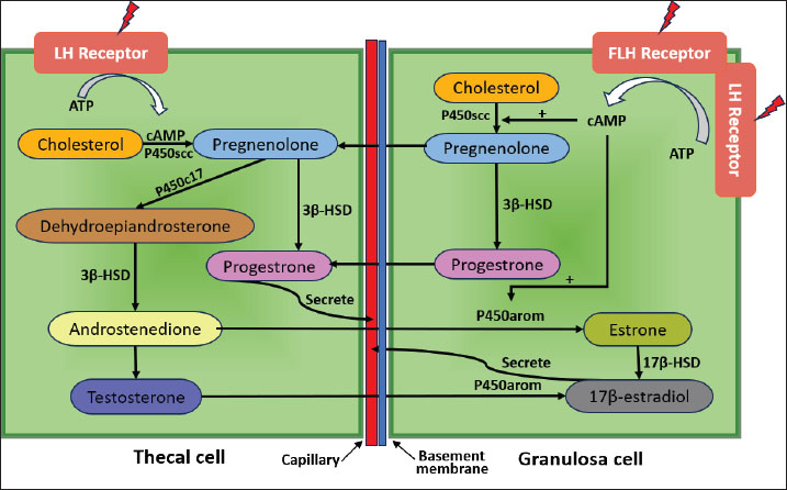 Fig. 4. Interaction of theca and granulosa cells in estrogen synthesis. Cholesterol is the primary building block for the production of progesterone and all other steroid hormones (Hu et al., 2010). The cholesterol transporter protein (StAR; Steroidogenic Acute Regulatory protein) helps move cholesterol into the mitochondria in GCs (Miller, 2007). This procedure is a crucial regulatory stage in steroid hormone production. Cholesterol is metabolized to pregnenolone in the mitochondria by the enzyme cytochrome P450scc (CYP11A1) (Mast et al., 2011). The crucial chemical pregnenolone serves as the starting point for progesterone synthesis (Liang and Rasmusson, 2018). Subsequently, pregnenolone undergoes a number of transformations, including conversion via the enzyme 3β-HSD (Slominski et al., 2013). Hormones and growth factors, such as LH and IGF-1, can control the activity of enzymes like 3β-HSD that are part of the progesterone production pathway (Hayes et al., 2024). Environmental factors such as growth factors, hormone concentrations, and culture media can influence progesterone synthesis in cumulus oophorus cultures (Lucidi et al., 2003). Generally, progesterone synthesis is significantly increased in cumulus oophorus cultures treated with LH and IGF-1 (Turathum et al., 2021). To establish conditions that promote hormone synthesis activity, culture media must be properly chosen. Serum IGF-1 and LH can boost progesterone production (Fig. 5).