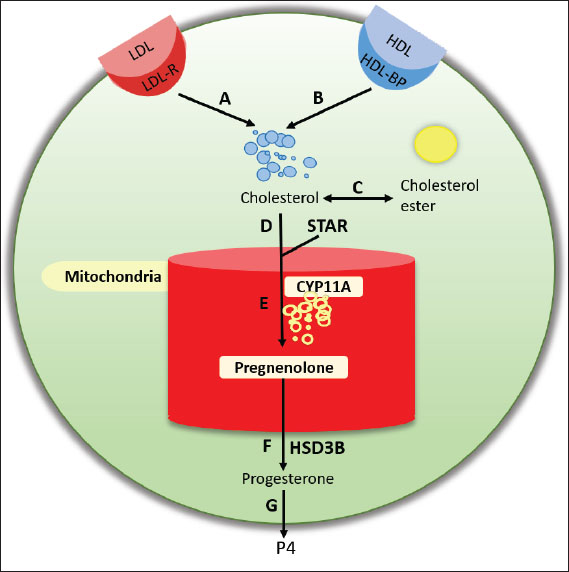 Fig. 5. Progesterone synthesis requires cholesterol from LDL and high-density lipoprotein. Although cumulus oophorus cells possess steroidogenic capacity and can produce progesterone in vitro, their practical application as an alternative progesterone source is restricted by several biological and technical limitations. First, the number of cumulus cells retrieved from each cumulus–oocyte complex is inherently limited, which limits the total hormone yield. Since these cells are primary somatic cells, their lifespan in culture is short, and their steroidogenic activity declines rapidly after isolation, resulting in a brief window for optimal hormone production (Turathum et al., 2021). Second, progesterone synthesis in cumulus cells exhibits substantial variability and is influenced by donor-specific factors such as age, reproductive status, follicular stage, and prior hormonal stimulation (Pan et al., 2024). This biological variability can compromise reproducibility across experiments or ART cycles. Moreover, in vitro luteinization—while enhancing progesterone secretion—often alters the estrogen-to-progesterone ratio, potentially creating a hormonal profile that is not ideal for certain stages of oocyte maturation or embryo development (Mesen and Young, 2015). Third, progesterone output from cumulus oophorus cells is highly sensitive to culture parameters, including medium composition, gonadotropin or growth factor supplementation, oxygen tension, and temperature stability (Simon et al., 2020). Even minor deviations from optimal conditions can reduce steroidogenic activity. Additionally, because their natural role is to support the oocyte rather than act as a primary endocrine source, the quantity of progesterone they produce in vitro is considerably lower than that of the corpus luteum, making it challenging to achieve physiologically relevant concentrations without substantial cell mass (da Silva Rosa et al., 2024). In vitro embryonic developmentIn culture media such as Tissue Culture Medium-199, Potassium Simplex Optimized Medium, Ham’s F-10, human tubal fluid medium, and others that contain protein, energy sources, and buffers, zygotes generated from in vitro fertilization can grow and divide into 2, 4, 8, and 16 cells to form morula and blastocysts (Gardner et al., 2000). Furthermore, in order for cells to grow and divide adequately, embryo culture must be conducted in an environment with 5% CO2. The in vitro embryo culture technique significantly impacts the success of additional embryo development and the implantation procedure in the recipient’s body (Hemkemeyer et al., 2014). Amino acids can influence the rate of development, boost the number of blastocyst cells, and raise maternal mRNA levels in oocyte maturation medium (Xiong et al., 2024). The addition of glutamate and non-essential amino acids to culture media can greatly accelerate development to the 8–16 cell and blastocyst stages (Itami et al., 2024). However, it cannot promote embryonic development if glutamine alone is administered. This further demonstrates that glutamine functions as an energy source and a medium osmolarity regulator (Huang et al., 2020). The addition of non-essential amino acids along with glutamine has a more stimulating effect than the mere presence of essential amino acids. This demonstrates unequivocally that sheep, cows, mice, and hamsters have different transport systems for essential and non-essential amino acids in their cells (Watford, 2015). Nevertheless, the medium’s amino acids may also raise ammonium levels, which may prevent blastocyst growth and cell division (Van Winkle, 2021). Furthermore, the presence of amino acids in the media may exacerbate the occurrence of cytoplasmic fragmentation in sheep embryos (Da Broi et al., 2018). A fresh culture medium needs to be used every 48–72 hours to get around this. Early embryonic development frequently encounters challenges. Inhibition typically occurs at the two-cell stage in mouse and rat embryos and at the eight-cell stage in cow and sheep embryos (Latham, 2023). This situation can be solved by replacing glucose as an energy source with pyruvate and lactate in culture media. According to Hong et al. (2023), blastocyst development is correlated with glucose use. The embryo uses pyruvate throughout the preimplantation phase before reaching the blastocyst, but glucose is more necessary during blastocyst development (Mu et al., 2022). Throughout the early stages of cow embryo development, glucose metabolism is very low, although glutamine and pyruvate metabolism increase (Krisher and Prather, 2012). Only during the 8–16 cell stage, which is linked to the activation of the embryonic genome, does glucose metabolism start to rise (Wang et al., 2023). The sheep embryo uses glucose to transform it into lactate, which is then extracted from the cells (Darby et al., 2023). Cattle developmental delay in the 8-cell stage is linked to oocyte cytoplasmic quality. Embryos that are unable to transcribe their own genome will not develop, but oocytes require all proteins and mRNAs to reach the 4 or 5 cell stage (Mu et al., 2024). The oocyte cytoplasm, which is critical for healthy embryo development, has a significant impact on the active demethylation of cytosine methylation in the spermatozoa genome to produce the zygote nucleus in mammals (Beaujean et al., 2004). Culturing oocytes and embryos in high quantities can increase the quality of low-quality embryos. Group culture of 20 embryos in 500 ml of media improves the growth ability of the embryos (Smith et al, 2012). The male and female sexes impact the blastocyst formation and embryo cell division rates. Cell division and blastocyst formation occur more quickly in cattle embryos derived from parents of various breeds than in those derived from parents of the same breed (Shorten et al., 2018). Embryos that develop to the 8-cell stage within 48 hours of fertilization produce blastocysts mo
