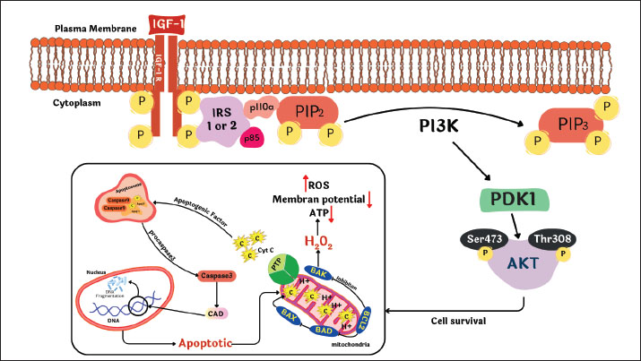 Fig. 6. Role of IGF-1 in preventing the apoptosis cascade through the PI3K/Akt pathway. Estrogen, particularly through its function in controlling oocyte development and the reproductive cycle, significantly influences cattle’s FIV process. The maturation process of oocytes is influenced by estrogen. Estrogen promotes the growth of healthy, mature oocytes by inducing papillary follicle growth (Guo et al., 2004). The likelihood of successful fertilization and high-quality embryo production is higher for mature oocytes (Yu et al., 2015). Estrogen is frequently added to the embryo culture medium during IVF procedures to promote cell development and embryo growth. Estrogen can enhance the quality and survival rate of embryos in culture by fostering an environment that is abundant in nutrients and development factors (Salek et al., 2025). Additionally, estrogen increases cellular metabolism, which is crucial for embryo growth. Estrogen helps guarantee that the embryo has enough energy and nutrients to develop normally by increasing the metabolic rate (Mahboobifard et al., 2022). The FIV process in cows is significantly influenced by progesterone. Progesterone may have an impact on the quality of embryos (Yovel et al., 1995; Salehnia and Zavareh, 2013; Kalakota et al., 2022). Progesterone can help create a healthy, high-quality embryo by creating a stable and encouraging environment. Literature integrationA comprehensive and critical literature review reveals the potential and current limitations of using growth factors—particularly IGF-1—and sex steroid hormones derived from cultured hepatic and cumulus cells in supporting bovine IVF. IGF-1 enhances oocyte maturation, promotes embryonic development, and improves blastocyst quality in various species, including cattle, swine, and mice (Pereira et al., 2019; Sato et al., 2017; Barrera et al., 2023; Lin et al., 2003). However, a closer examination of the available data indicates that these outcomes are often context-dependent, varying with IGF-1 concentration, timing, and specific developmental stage. While some studies support the use of exogenous IGF-1 in oocyte maturation and embryo culture media, others report limited or inconsistent improvements in developmental competence, suggesting the need for more standardized protocols and comparative studies (Fernandez-Gonzalez et al., 2021; Carrillo-Gonzalez et al., 2024). Cumulus cells have been shown to synthesize small amounts of estradiol and progesterone in vitro, contributing to the oocyte microenvironment; however, the endocrine significance of these secretions remains unclear without in vivo validation or dose-response analyses (Harl et al., 2025). The literature also reflects a gap in experimental studies evaluating the direct use of liver- or cumulus-derived IGF-1 and steroids in practical IVF systems (Ohlsson et al., 2009). Most current findings are extrapolated from indirect observations or model organisms, underscoring the need for species-specific, mechanistic investigations in bovine models. Few studies have addressed the technical aspects of IGF-1 purification from primary cell cultures or its stability in culture media—critical factors for successful translation to applied reproductive biotechnology (Park et al., 2020; Venkatesan et al., 2022). Taken together, the literature not only offers promising insights but also highlights the fragmented and preliminary nature of current knowledge. Therefore, the use of liver and cumulus cell culture products as bioactive supplements for IVF remains largely theoretical and warrants further research through well-controlled, reproducible, and comparative studies to establish biological relevance, efficacy, and scalability (Cairo Consensus Group C, 2020). Limitations and future perspectivesThe scarcity of recent in vivo data on the practical use of liver- and cumulus cell-derived factors in bovine IVF limits this review. Most current findings originate from in vitro studies or non-bovine models, which may limit the direct applicability of the results to cattle reproduction. Furthermore, significant challenges remain in the purification, standardization, and stability of bioactive molecules, potentially affecting their reproducibility and scalability. Future research should focus on validating these approaches through well-controlled animal studies, optimizing protocols for large-scale application, and exploring biotechnological innovations that can ensure consistent quality and cost-effective production of these factors. ConclusionCattle liver, a slaughterhouse by-product, can serve as an IGF-1 source, while the ovaries produce estrogen and progesterone. Supplementation of these bioactive compounds obtained through tissue culture may enhance the success of IVF in cattle. This strategy offers the potential to produce genetically superior males for frozen semen production, thereby improving the productivity of both dairy and beef cattle. AcknowledgmentsThe authors thank Universitas Airlangga and Badan Riset dan Inovasi Nasional. Author’s contributionsSM, ARK, IM, and FAR drafted the manuscript. RZA, SW, DAAK, and AOA revised and edited the manuscript. UFH, ATK, and BWKW prepared and critically checked this manuscript. LA, LL, and BPP edited the references. All authors have read and approved the final version of the manuscript. Conflict of interestThe authors declare no conflict of interest. FundingThe authors funded this study. Data availabilityAll references are open access, so data can be obtained from the internet. ReferencesAhmad, S.S., Ahmad, K., Lee, E.J., Lee, Y.H. and Choi, I. 2020. Implications of insulin-like growth factor-1 in skeletal muscle and various diseases. Cells 9(8), 1773. Al-Samerria, S. and Radovick, S. 2021. The role of insulin-like growth factor-1 (IGF-1) in the control of neuroendocrine regulation of growth. Cells 10(10), 2664. Al-Samerria, S. and Radovick, S. 2023. Exploring the therapeutic potential of targeting