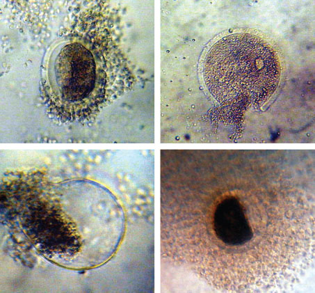 Fig. 3. Some forms of oocytes that undergo degeneration after vitrification. Table 1. Percentage of normal morphology and apoptosis in fresh oocytes (before) and after in vitro maturation.