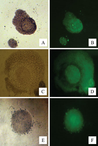 Fig. 4. HSP70 expression in fresh oocytes (A,B), post-IVM oocytes (C,D), and post-vitrification oocytes (E,F) by immunofluorescence using FITC marker. Normal (A,C, and E) and fluorescent (B, D, and F) light.
