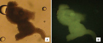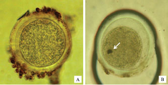 Fig. 5. Cytochrome c expression in oocytes by immunofluorescence with FITC marker Normal (A) and fluorescence (B) light.