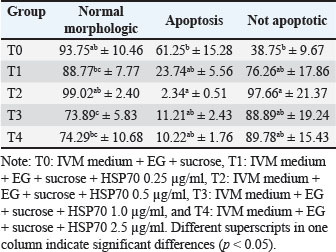 Figure 4 shows HSP70 expression in fresh oocytes, post-IVM oocytes, and post-vitrification oocytes. Without the addition of HSP70 in the vitrification medium, the percentage of oocytes undergoing apoptosis was the highest (Table 3). The addition of 0.5 µg/ml HSP70 (T2 group) resulted in the highest percentage of oocytes with normal morphology (99.02% ± 2.40%) and the lowest percentage of apoptotic oocytes (2.34% ± 0.51%), with both differences being statistically significant (p < 0.05) compared to the other treatment groups. Figure 5 shows the expression of cytochrome c in oocytes using the immunofluorescence method with the FITC marker. Figure 6 shows the expression of caspase-3 in oocytes by immunofluorescence using the FITC marker.