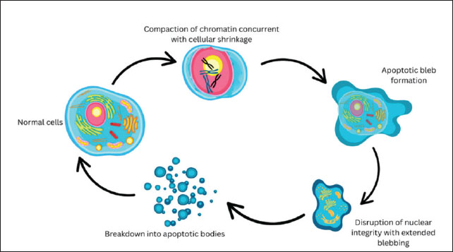 Fig. 1. Morphological changes during apoptosis. Normal cells undergo chromatin compaction concurrent with cellular shrinkage, followed by apoptotic bleb formation. Subsequent disruption of nuclear integrity with extended membrane blebbing leads to cell fragmentation into apoptotic bodies, which are ultimately phagocytosed by surrounding cells or macrophages. The occurrence of apoptosis is marked by a typical biochemical marker, namely DNA fragmentation, which was confirmed using the TdT-mediated dUTP nick end labeling method (Denton and Kumar, 2015). Several pathological conditions, such as radiation, environmental toxicants, oxidative stress, and temperature stress, can initiate apoptosis in mammalian oocytes (Roth and Hansen, 2004). Similarly, oocytes are exposed to several stressors during cryopreservation, such as temperature, osmotic, and toxicity, which are never experienced physiologically (Comizzoli et al., 2008). Using the TUNEL method, it is possible to determine which oocytes have undergone apoptosis from the visible nuclear color (Ghafari et al., 2007). Cells undergoing apoptosis will have a brown nucleus and a granular appearance due to DNA fragmentation (Schulze-Osthoff et al., 1994). Apoptosis occurs through several pathways. The pathway that leads to apoptosis can be passed through the interaction between the death ligands, namely Fas ligand (FasL) and Tumor Necrosis Factor α (TNF α) with their receptors. Fas receptors and TNF receptors will trigger the activation of proteases (Arguello and Haisma, 2021). Activation of procaspase 8 will break down Bid, causing the release of cytochrome c from mitochondria, which will trigger the formation of the APAF-1 and caspase 9 complex, and protease activity will continue until it ends in the destruction of the cell structure or apoptosis (Li et al., 1997). In addition, apoptosis can also occur if mitochondria are damaged so that the MPTP opens. The opening of this MPTP will cause the secretion of cytochrome c and other molecules, namely APAF-1, which together with caspase 9 will activate caspase 3 (Yapryntseva et al., 2024). Temperature stress on vitrified oocytes can also cause DNA damage. DNA-encoded genetic information is a "blueprint" for protein production (Walker and Biase, 2020). Therefore, the function of a gene can be inferred from its nucleotide sequence. For example, the suspected amino acid sequence can be compared with the known gene’s protein sequence. Significant sequence similarities indicate the same protein function (Pearson, 2013). If there is an error in encoding the genetic information of this protein synthesis, the protein will not normally perform its biological function. This damage can be small-scale damage that is classified as a point mutation, frameshift mutation, or damage to macrochromosomal structures, such as translocations and deletions (Chatterjee and Walker, 2017). Although both belong to the HSP70 protein family, fundamental differences exist between the inducible form of HSP72 and the constitutive form of HSC70. HSP72 is the induced form specifically in response to cellular stress, such as heat, oxidative stress, or vitrification. Its expression is controlled by heat shock factor 1 (HSF1) and increases sharply when cells encounter extreme conditions (Volloch et al., 2000). HSP72 functions primarily to protect cells from damage by assisting in the refolding of denatured proteins, preventing protein aggregation, and inhibiting apoptotic pathways (Park et al., 2001). In contrast, HSC70 is a constitutively expressed form, indicating that it is always present in cells even in the absence of stress. Its primary role is as a housekeeping protein, such as assisting in the folding of new proteins, interorganelle protein transport, and misfolded protein degradation (Chen and Brown, 2007). In the context of stress responses, HSP72 acts as an emergency protector, whereas HSC70 ensures protein stability and daily function (Xu et al., 2011). The two work together to maintain cellular homeostasis. Notably, HSP70 expression is not uniform across oocyte developmental stages. During the germinal vesicle (GV) stage, oocytes actively synthesize and accumulate HSP70, providing a reservoir of protective proteins that can be mobilized under stress conditions. In contrast, metaphase II (MII) oocytes largely rely on pre-accumulated HSP70 stores and show limited inducibility, which may explain their higher susceptibility to cryoinjury during vitrification. This stage-dependent pattern highlights the importance of timing and developmental context in determining the protective efficacy of HSP70 during cryopreservation (Neuer, 2000; Lánská et al., 2006; Miętkiewska et al., 2022). The effects of mutations on protein function are shown in Figure 2. Mutations that occur in the coding region produce proteins with abnormal structures that will lose or increase their function or have new functions but cause abnormalities or diseases (Gerasimavicius et al., 2022). Mutations in regulatory domains can cause proteins to lose or increase their function. Mutations in the coding region or regulatory domains can reduce the amount of protein (Vihinen, 2021).
