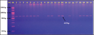 Fig. 4. Agarose gel electrophoresis of polymerase chain reaction products at 100 V and 80 mA for 90 minutes. Lane (M): ladder marker. Lane (NC): negative control. Lane (PC): positive control. Lanes 8, 9, 12, 14, 16, and 17: negative samples. Lanes 1, 2, 3, 4, 5, 6, 7, 10, 11, 13, 15, 18, 19, 20, and 21: positive samples at 615 bp.