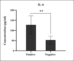 Fig. 9. Levels of immune IL-6 marker among the positively (total number=19) and negatively (total number=108) infected dogs with colibacillosis; significance ** (p < 0.0093).
